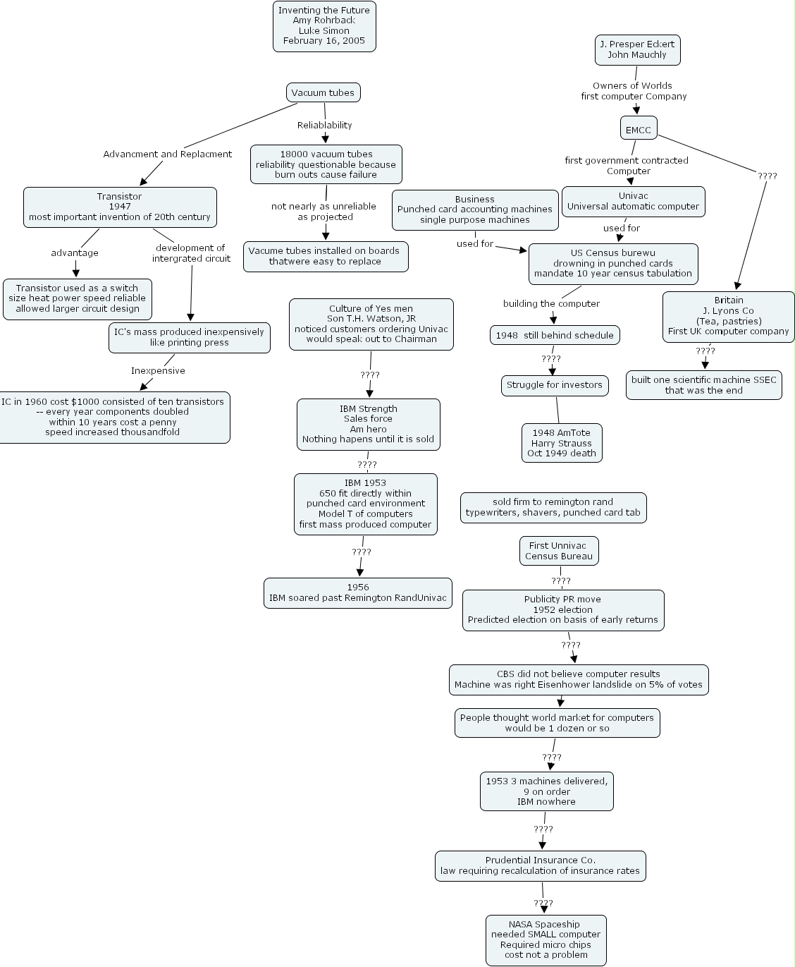 Univac Universal automatic computer used for US Census burewu drowning in punched cards mandate 10 year census tabulation, IBM 1953 650 fit directly within punched card environment Model T of computers first mass produced computer ???? 1956 IBM soared past Remington RandUnivac, Transistor 1947 most important invention of 20th century development of intergrated circuit IC's mass produced inexpensively like printing press, EMCC ???? Britain J. Lyons Co (Tea, pastries) First UK computer company, Transistor 1947 most important invention of 20th century advantage Transistor used as a switch size heat power speed reliable allowed larger circuit design, 1948 still behind schedule ???? ????, First Unnivac Census Bureau ???? Publicity PR move 1952 election Predicted election on basis of early returns, EMCC first government contracted Computer Univac Universal automatic computer, J. Presper Eckert John Mauchly Owners of Worlds first computer Company EMCC, IC's mass produced inexpensively like printing press Inexpensive IC in 1960 cost $1000 consisted of ten transistors -- every year components doubled within 10 years cost a penny speed increased thousandfold, 1953 3 machines delivered, 9 on order IBM nowhere ???? Prudential Insurance Co. law requiring recalculation of insurance rates, Britain J. Lyons Co (Tea, pastries) First UK computer company ???? built one scientific machine SSEC that was the end, People thought world market for computers would be 1 dozen or so ???? 1953 3 machines delivered, 9 on order IBM nowhere, IBM Strength Sales force Am hero Nothing hapens until it is sold ???? IBM 1953 650 fit directly within punched card environment Model T of computers first mass produced computer, Struggle for investors ???? 1948 AmTote Harry Strauss Oct 1949 death, US Census burewu drowning in punched cards mandate 10 year census tabulation building the computer 1948 still behind schedule, Prudential Insurance Co. law requiring recalculation of insurance rates ???? NASA Spaceship needed SMALL computer Required micro chips cost not a problem, 18000 vacuum tubes reliability questionable because burn outs cause failure not nearly as unreliable as projected Vacume tubes installed on boards thatwere easy to replace, Culture of Yes men Son T.H. Watson, JR noticed customers ordering Univac would speak out to Chairman ???? IBM Strength Sales force Am hero Nothing hapens until it is sold, Vacuum tubes Advancment and Replacment Transistor 1947 most important invention of 20th century, Vacuum tubes Reliablability 18000 vacuum tubes reliability questionable because burn outs cause failure, CBS did not believe computer results Machine was right Eisenhower landslide on 5% of votes ???? People thought world market for computers would be 1 dozen or so, 18000 vacuum tubes reliability questionable because burn outs cause failure not nearly as unreliable as projected Vacume tubes installed on boards thatwere easy to replace, Publicity PR move 1952 election Predicted election on basis of early returns ???? CBS did not believe computer results Machine was right Eisenhower landslide on 5% of votes, Business Punched card accounting machines single purpose machines used for US Census burewu drowning in punched cards mandate 10 year census tabulation