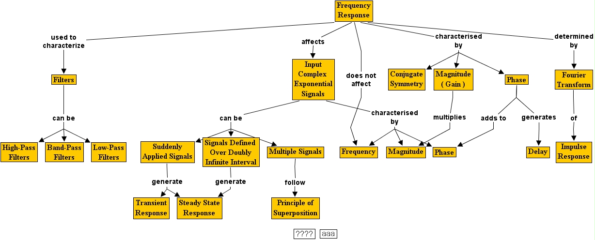 Input Complex Exponential Signals can be Signals Defined Over Doubly Infinite Interval, Input Complex Exponential Signals can be Multiple Signals, Input Complex Exponential Signals can be Suddenly Applied Signals, Fourier Transform of Impulse Response, Suddenly Applied Signals generate Transient Response, Suddenly Applied Signals generate Steady State Response, Frequency Response used to characterize Filters, Frequency Response determined by Fourier Transform, Magnitude ( Gain ) multiplies Magnitude, Filters can be High-Pass Filters, Filters can be Band-Pass Filters, Filters can be Low-Pass Filters, Frequency Response characterised by Magnitude ( Gain ), Frequency Response characterised by Phase, Frequency Response characterised by Conjugate Symmetry, Input Complex Exponential Signals characterised by Frequency, Input Complex Exponential Signals characterised by Phase, Input Complex Exponential Signals characterised by Magnitude, Frequency Response does not affect Frequency, Signals Defined Over Doubly Infinite Interval generate Steady State Response, Frequency Response affects Input Complex Exponential Signals, Multiple Signals follow Principle of Superposition, Phase adds to Phase, Phase generates Delay