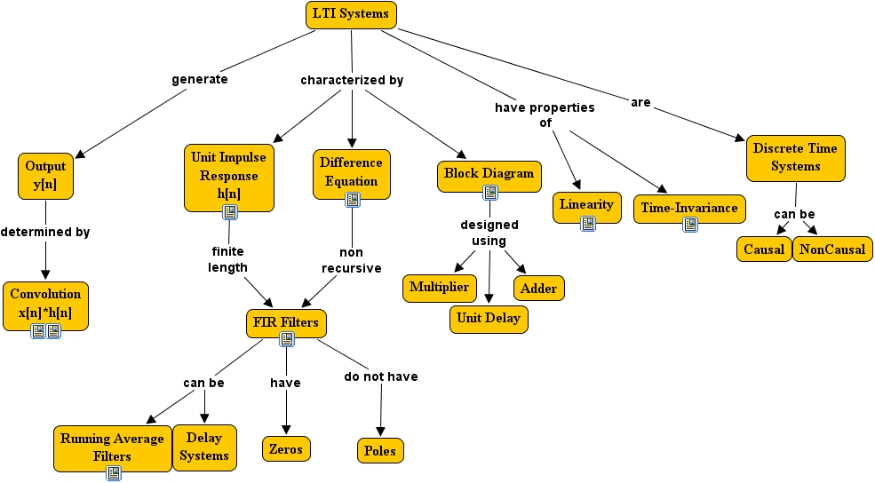 Output y[n] determined by Convolution x[n]*h[n], Block Diagram designed using Unit Delay, Block Diagram designed using Adder, Block Diagram designed using Multiplier, FIR Filters do not have Poles, LTI Systems characterized by Unit Impulse Response h[n], LTI Systems characterized by Difference Equation, LTI Systems characterized by Block Diagram, LTI Systems have properties of Linearity, LTI Systems have properties of Time-Invariance, LTI Systems generate Output y[n], Discrete Time Systems can be NonCausal, Discrete Time Systems can be Causal, LTI Systems are Discrete Time Systems, FIR Filters can be Delay Systems, FIR Filters can be Running Average Filters, Unit Impulse Response h[n] finite length FIR Filters, Difference Equation non recursive FIR Filters, FIR Filters have Zeros