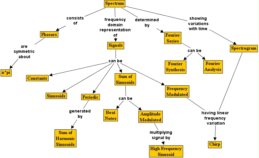 Frequency Modulated having linear frequency variation Chirp, Signals can be Sinusoids, Signals can be Sum of Sinusoids, Signals can be Periodic, Signals can be Constants, Signals can be Frequency Modulated, Sum of Sinusoids can be Beat Notes, Sum of Sinusoids can be Amplitude Modulated, Spectrogram having linear frequency variation Chirp, Phasors are symmetric about n*pi, Periodic generated by Sum of Harmonic Sinusoids, Spectrum determined by Fourier Series, Spectrum consists of Phasors, Amplitude Modulated multiplying signal by High Frequency Sinusoid, Spectrum showing variations with time Spectrogram, Fourier Series can be Fourier Synthesis, Fourier Series can be Fourier Analysis, Spectrum frequency domain representation of Signals