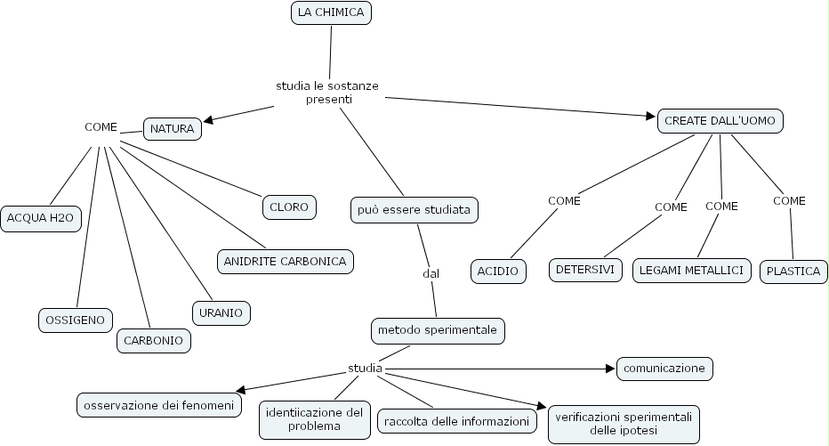 NATURA COME ACQUA H2O, NATURA COME CARBONIO, NATURA COME URANIO, NATURA COME OSSIGENO, NATURA COME CLORO, NATURA COME ANIDRITE CARBONICA, CREATE DALL'UOMO COME ACIDIO, pu� essere studiata dal metodo sperimentale, metodo sperimentale studia verificazioni sperimentali delle ipotesi, metodo sperimentale studia osservazione dei fenomeni, metodo sperimentale studia identiicazione del problema, metodo sperimentale studia raccolta delle informazioni, metodo sperimentale studia comunicazione, CREATE DALL'UOMO COME LEGAMI METALLICI, CREATE DALL'UOMO COME PLASTICA, CREATE DALL'UOMO COME DETERSIVI, LA CHIMICA studia le sostanze presenti NATURA, LA CHIMICA studia le sostanze presenti CREATE DALL'UOMO, LA CHIMICA studia le sostanze presenti pu� essere studiata