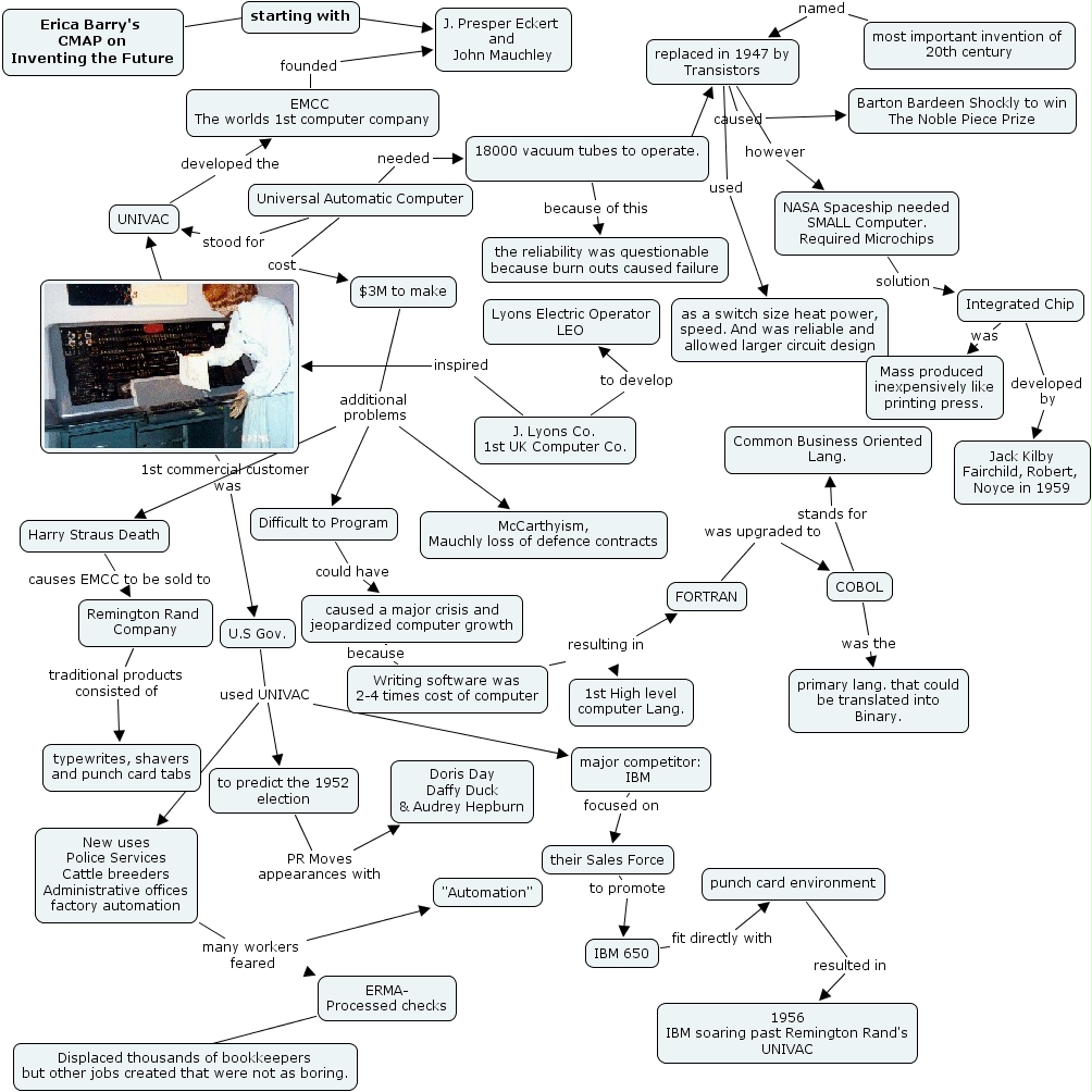 $3M to make additional problems Difficult to Program, $3M to make additional problems McCarthyism, Mauchly loss of defence contracts, $3M to make additional problems Harry Straus Death, COBOL was the primary lang. that could be translated into Binary., Writing software was 2-4 times cost of computer resulting in FORTRAN, Writing software was 2-4 times cost of computer resulting in 1st High level computer Lang., to predict the 1952 election PR Moves appearances with Doris Day Daffy Duck & Audrey Hepburn, 18000 vacuum tubes to operate. ???? replaced in 1947 by Transistors, NASA Spaceship needed SMALL Computer. Required Microchips solution Integrated Chip, Universal Automatic Computer needed 18000 vacuum tubes to operate. , J. Lyons Co. 1st UK Computer Co. inspired , 18000 vacuum tubes to operate. because of this the reliability was questionable because burn outs caused failure, their Sales Force to promote IBM 650, Remington Rand Company traditional products consisted of typewrites, shavers and punch card tabs, ???? UNIVAC, U.S Gov. used UNIVAC New uses Police Services Cattle breeders Administrative offices factory automation, U.S Gov. used UNIVAC major competitor: IBM , U.S Gov. used UNIVAC to predict the 1952 election, EMCC The worlds 1st computer company founded J. Presper Eckert and John Mauchley, Integrated Chip developed by Jack Kilby Fairchild, Robert, Noyce in 1959, major competitor: IBM focused on their Sales Force, Integrated Chip was Mass produced inexpensively like printing press., New uses Police Services Cattle breeders Administrative offices factory automation many workers feared ERMA- Processed checks, New uses Police Services Cattle breeders Administrative offices factory automation many workers feared "Automation", IBM 650 fit directly with punch card environment, caused a major crisis and jeopardized computer growth because Writing software was 2-4 times cost of computer, most important invention of 20th century named replaced in 1947 by Transistors, COBOL stands for Common Business Oriented Lang., replaced in 1947 by Transistors caused Barton Bardeen Shockly to win The Noble Piece Prize, 1st commercial customer was U.S Gov., J. Lyons Co. 1st UK Computer Co. to develop Lyons Electric Operator LEO, Harry Straus Death causes EMCC to be sold to Remington Rand Company, ERMA- Processed checks ???? Displaced thousands of bookkeepers but other jobs created that were not as boring., replaced in 1947 by Transistors however NASA Spaceship needed SMALL Computer. Required Microchips, replaced in 1947 by Transistors used as a switch size heat power, speed. And was reliable and allowed larger circuit design, UNIVAC developed the EMCC The worlds 1st computer company, Erica Barry's CMAP on Inventing the Future ???? J. Presper Eckert and John Mauchley, punch card environment resulted in 1956 IBM soaring past Remington Rand's UNIVAC, Universal Automatic Computer stood for UNIVAC, Universal Automatic Computer cost $3M to make, Difficult to Program could have caused a major crisis and jeopardized computer growth, FORTRAN was upgraded to COBOL