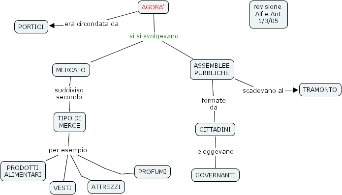 ASSEMBLEE PUBBLICHE scadevano al TRAMONTO, ASSEMBLEE PUBBLICHE formate da CITTADINI, MERCATO suddiviso secondo TIPO DI MERCE, AGORA' vi si svolgevano ASSEMBLEE PUBBLICHE, AGORA' vi si svolgevano MERCATO, TIPO DI MERCE per esempio PROFUMI, TIPO DI MERCE per esempio PRODOTTI ALIMENTARI, TIPO DI MERCE per esempio VESTI, TIPO DI MERCE per esempio ATTREZZI, CITTADINI eleggevano GOVERNANTI, AGORA' era circondata da PORTICI
