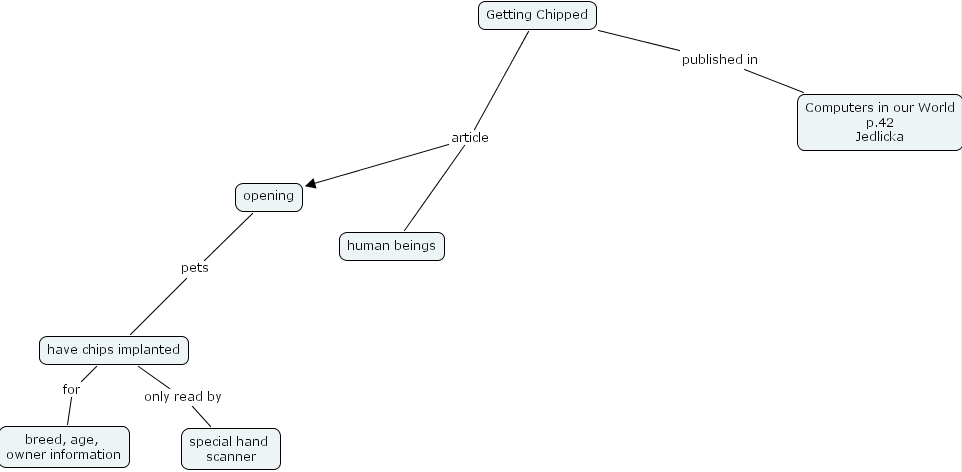 opening pets have chips implanted, Getting Chipped published in Computers in our World p.42 Jedlicka, have chips implanted only read by special hand scanner, Getting Chipped article human beings, Getting Chipped article opening, have chips implanted for breed, age, owner information