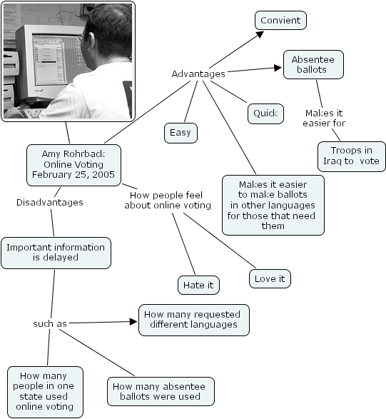 ???? Amy Rohrback Online Voting February 25, 2005, Amy Rohrback Online Voting February 25, 2005 Disadvantages Important information is delayed, Amy Rohrback Online Voting February 25, 2005 Advantages Easy, Amy Rohrback Online Voting February 25, 2005 Advantages Makes it easier to make ballots in other languages for those that need them, Amy Rohrback Online Voting February 25, 2005 Advantages Convient, Amy Rohrback Online Voting February 25, 2005 Advantages Absentee ballots , Amy Rohrback Online Voting February 25, 2005 Advantages Quick, Amy Rohrback Online Voting February 25, 2005 How people feel about online voting Love it, Amy Rohrback Online Voting February 25, 2005 How people feel about online voting Hate it, Important information is delayed such as How many requested different languages, Important information is delayed such as How many people in one state used online voting, Important information is delayed such as How many absentee ballots were used, Absentee ballots Makes it easier for Troops in Iraq to vote