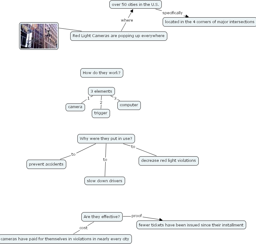 3 elements 1 camera, 3 elements 2 trigger, Red Light Cameras are popping up everywhere ???? , Red Light Cameras are popping up everywhere ???? , 3 elements 3 computer, over 50 cities in the U.S. specifically located in the 4 corners of major intersections, Why were they put in use? to prevent accidents, Are they effective? proof fewer tickets have been issued since their installment, Red Light Cameras are popping up everywhere where over 50 cities in the U.S., Are they effective? cost cameras have paid for themselves in violations in nearly every city, Why were they put in use? to decrease red light violations, Why were they put in use? to slow down drivers