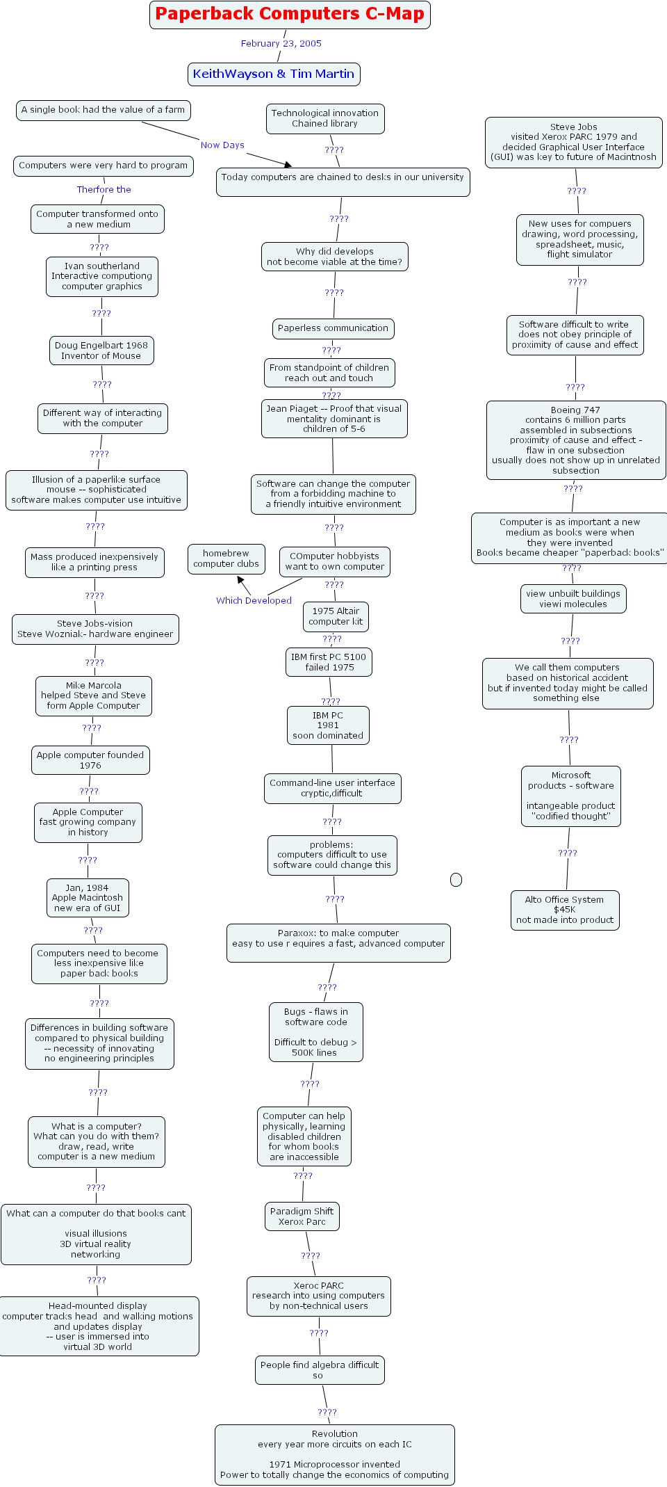 IBM first PC 5100 failed 1975 ???? Command-line user interface cryptic,difficult , IBM first PC 5100 failed 1975 ???? IBM PC 1981 soon dominated, 1975 Altair computer kit ???? IBM first PC 5100 failed 1975, What can a computer do that books cant visual illusions 3D virtual reality networking ???? Head-mounted display computer tracks head and walking motions and updates display -- user is immersed into virtual 3D world, Bugs - flaws in software code Difficult to debug > 500K lines ???? Computer can help physically, learning disabled children for whom books are inaccessible, Apple computer founded 1976 ???? Apple Computer fast growing company in history, Ivan southerland Interactive computiong computer graphics ???? Doug Engelbart 1968 Inventor of Mouse, What is a computer? What can you do with them? draw, read, write computer is a new medium ???? What can a computer do that books cant visual illusions 3D virtual reality networking, Paraxox: to make computer easy to use r equires a fast, advanced computer ???? Bugs - flaws in software code Difficult to debug > 500K lines , From standpoint of children reach out and touch ???? Software can change the computer from a forbidding machine to a friendly intuitive environment, From standpoint of children reach out and touch ???? Jean Piaget -- Proof that visual mentality dominant is children of 5-6, From standpoint of children reach out and touch ???? Jean Piaget -- Proof that visual mentality dominant is children of 5-6, Today computers are chained to desks in our university ???? Why did develops not become viable at the time?, Different way of interacting with the computer ???? Illusion of a paperlike surface mouse -- sophisticated software makes computer use intuitive, Computer can help physically, learning disabled children for whom books are inaccessible ???? Paradigm Shift Xerox Parc, Boeing 747 contains 6 million parts assembled in subsections proximity of cause and effect - flaw in one subsection usually does not show up in unrelated subsection ???? Computer is as important a new medium as books were when they were invented Books became cheaper "paperback books", COmputer hobbyists want to own computer ???? 1975 Altair computer kit, Apple Computer fast growing company in history ???? Jan, 1984 Apple Macintosh new era of GUI, Software can change the computer from a forbidding machine to a friendly intuitive environment ???? COmputer hobbyists want to own computer, Software difficult to write does not obey principle of proximity of cause and effect ???? Boeing 747 contains 6 million parts assembled in subsections proximity of cause and effect - flaw in one subsection usually does not show up in unrelated subsection, A single book had the value of a farm Now Days Today computers are chained to desks in our university , Steve Jobs visited Xerox PARC 1979 and decided Graphical User Interface (GUI) was key to future of Macintnosh ???? New uses for compuers drawing, word processing, spreadsheet, music, flight simulator, Steve Jobs-vision Steve Wozniak- hardware engineer ???? Mike Marcola helped Steve and Steve form Apple Computer, problems: computers difficult to use software could change this ???? Paraxox: to make computer easy to use r equires a fast, advanced computer , Paradigm Shift Xerox Parc ???? Xeroc PARC research into using computers by non-technical users, Paperless communication ???? From standpoint of children reach out and touch, Differences in building software compared to physical building -- necessity of innovating no engineering principles ???? What is a computer? What can you do with them? draw, read, write computer is a new medium, view unbuilt buildings viewi molecules ???? We call them computers based on historical accident but if invented today might be called something else , Mass produced inexpensively like a printing press ???? Steve Jobs-vision Steve Wozniak- hardware engineer, Computers need to become less inexpensive like paper back books ???? Differences in building software compared to physical building -- necessity of innovating no engineering principles, People find algebra difficult so ???? Revolution every year more circuits on each IC 1971 Microprocessor invented Power to totally change the economics of computing, Mike Marcola helped Steve and Steve form Apple Computer ???? Apple computer founded 1976, Technological innovation Chained library ???? Today computers are chained to desks in our university , Paperback Computers C-Map February 23, 2005 KeithWayson & Tim Martin, Why did develops not become viable at the time? ???? Paperless communication, Xeroc PARC research into using computers by non-technical users ???? People find algebra difficult so , Microsoft products - software intangeable product "codified thought" ???? Alto Office System $45K not made into product, COmputer hobbyists want to own computer Which Developed homebrew computer clubs, New uses for compuers drawing, word processing, spreadsheet, music, flight simulator ???? Software difficult to write does not obey principle of proximity of cause and effect, Computer transformed onto a new medium ???? Ivan southerland Interactive computiong computer graphics, We call them computers based on historical accident but if invented today might be called something else ???? Microsoft products - software intangeable product "codified thought", Illusion of a paperlike surface mouse -- sophisticated software makes computer use intuitive ???? Mass produced inexpensively like a printing press, Computers were very hard to program Therfore the Computer transformed onto a new medium, Computer is as important a new medium as books were when they were invented Books became cheaper "paperback books" ???? view unbuilt buildings viewi molecules, Doug Engelbart 1968 Inventor of Mouse ???? Different way of interacting with the computer, Jan, 1984 Apple Macintosh new era of GUI ???? Computers need to become less inexpensive like paper back books, Command-line user interf