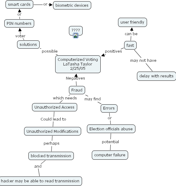 Fraud which needs Unauthorized Access, fast can be user friendly, Election officials abuse potential computer failure, Computerized Voting LaTasha Taylor 2/25/05 possible solutions, PIN numbers or smart cards, fast positives Computerized Voting LaTasha Taylor 2/25/05, smart cards or biometric devices, fast may not have delay with results, solutions voter PIN numbers, Unauthorized Modifications perhaps blocked transmission, blocked transmission and hacker may be able to read transmission, Fraud Negatives Computerized Voting LaTasha Taylor 2/25/05, Errors or Election officials abuse, Unauthorized Access Could lead to Unauthorized Modifications, Fraud may find Errors