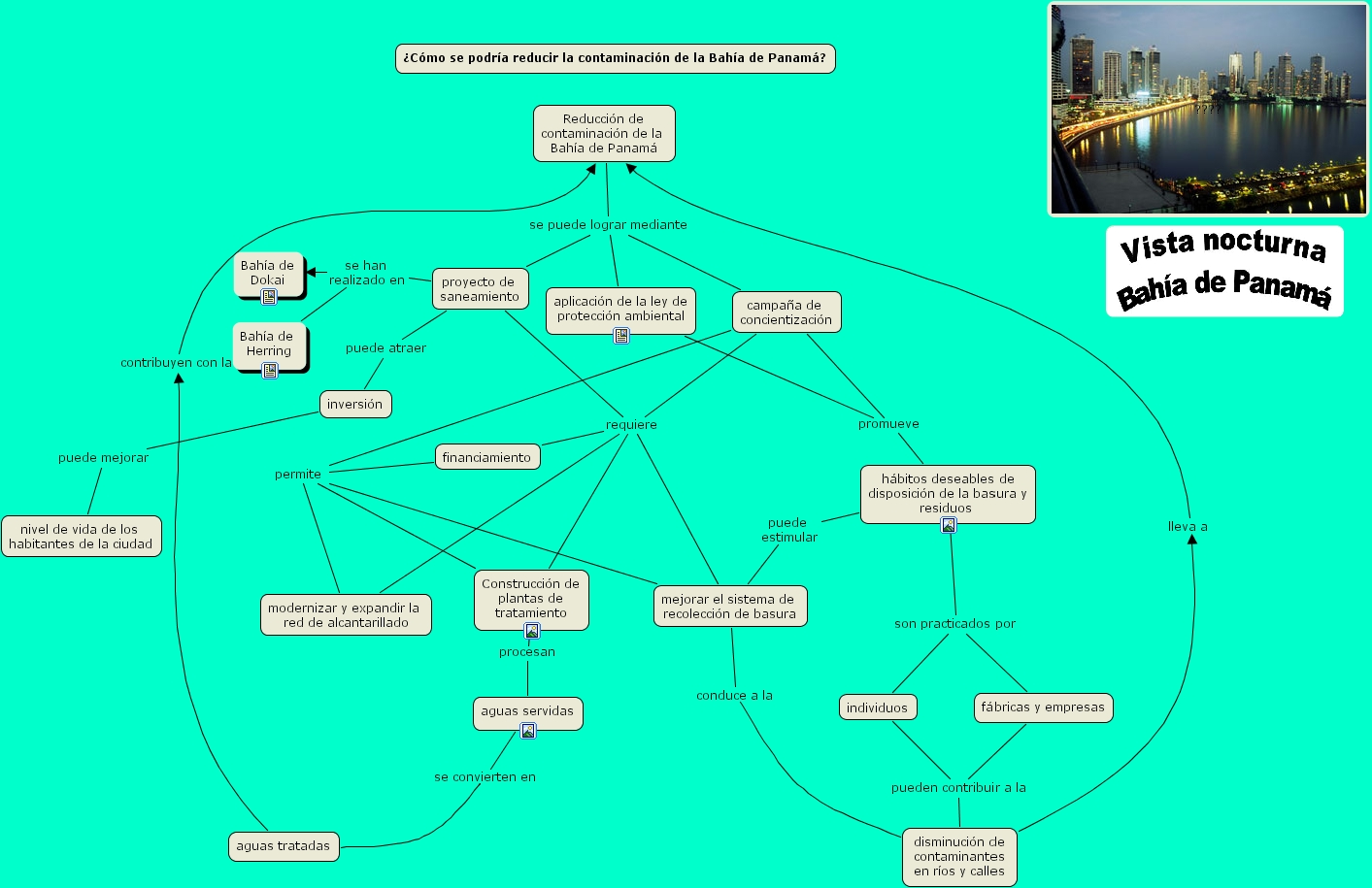 aguas tratadas contribuyen con la Reducci�n de contaminaci�n de la Bah�a de Panam�, h�bitos deseables de disposici�n de la basura y residuos son practicados por individuos, h�bitos deseables de disposici�n de la basura y residuos son practicados por f�bricas y empresas, proyecto de saneamiento requiere modernizar y expandir la red de alcantarillado, proyecto de saneamiento requiere financiamiento, proyecto de saneamiento requiere mejorar el sistema de recolecci�n de basura, proyecto de saneamiento requiere campa�a de concientizaci�n, proyecto de saneamiento requiere Construcci�n de plantas de tratamiento, mejorar el sistema de recolecci�n de basura conduce a la disminuci�n de contaminantes en r�os y calles, campa�a de concientizaci�n promueve h�bitos deseables de disposici�n de la basura y residuos, aplicaci�n de la ley de protecci�n ambiental promueve h�bitos deseables de disposici�n de la basura y residuos, inversi�n puede mejorar nivel de vida de los habitantes de la ciudad, proyecto de saneamiento se han realizado en Bah�a de Dokai, proyecto de saneamiento se han realizado en Bah�a de Herring, financiamiento permite modernizar y expandir la red de alcantarillado, financiamiento permite campa�a de concientizaci�n, financiamiento permite mejorar el sistema de recolecci�n de basura, financiamiento permite Construcci�n de plantas de tratamiento, proyecto de saneamiento puede atraer inversi�n, aguas servidas se convierten en aguas tratadas, individuos pueden contribuir a la disminuci�n de contaminantes en r�os y calles, Reducci�n de contaminaci�n de la Bah�a de Panam� se puede lograr mediante proyecto de saneamiento, Reducci�n de contaminaci�n de la Bah�a de Panam� se puede lograr mediante aplicaci�n de la ley de protecci�n ambiental, Reducci�n de contaminaci�n de la Bah�a de Panam� se puede lograr mediante campa�a de concientizaci�n, f�bricas y empresas pueden contribuir a la disminuci�n de contaminantes en r�os y calles, disminuci�n de contaminantes en r�os y calles lleva a Reducci�n de contaminaci�n de la Bah�a de Panam�, Construcci�n de plantas de tratamiento procesan aguas servidas, mejorar el sistema de recolecci�n de basura puede estimular h�bitos deseables de disposici�n de la basura y residuos