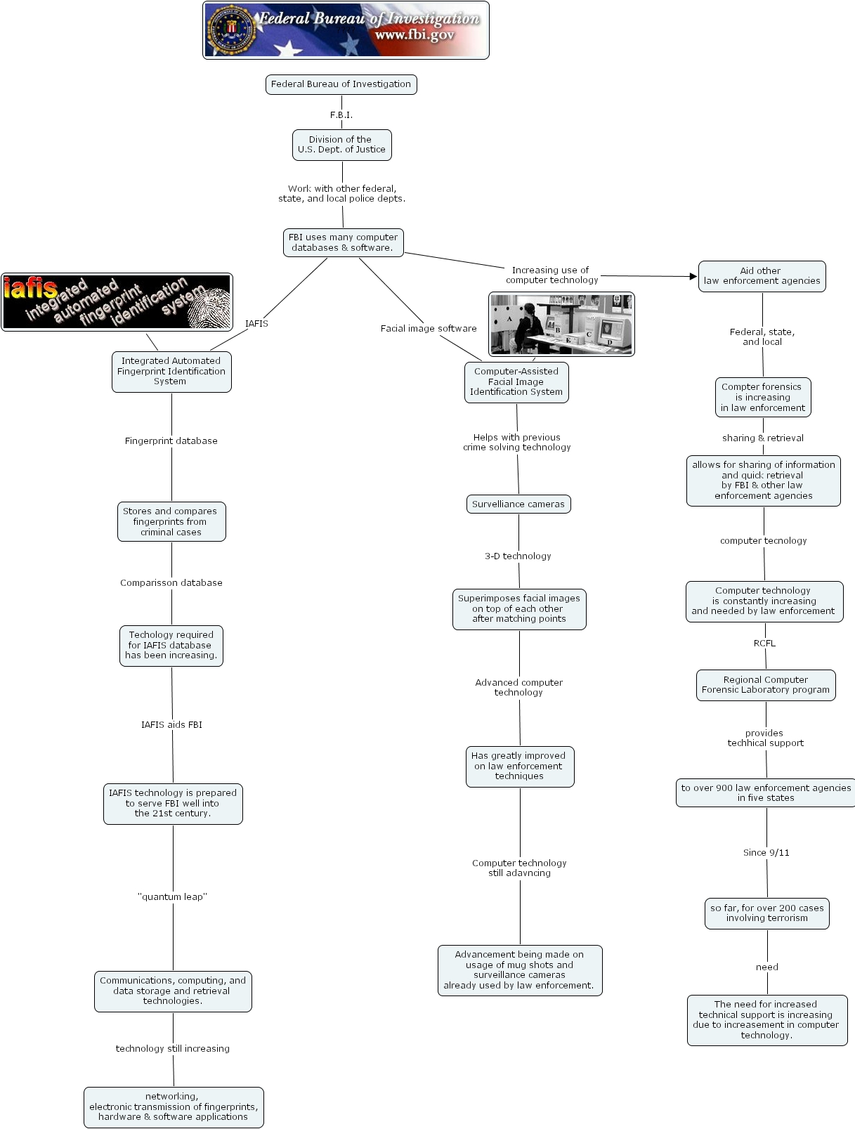 FBI uses many computer databases & software. Facial image software Computer-Assisted Facial Image Identification System, Stores and compares fingerprints from criminal cases Comparisson database Techology required for IAFIS database has been increasing., Aid other law enforcement agencies Federal, state, and local Compter forensics is increasing in law enforcement, FBI uses many computer databases & software. Increasing use of computer technology Aid other law enforcement agencies, Communications, computing, and data storage and retrieval technologies. technology still increasing networking, electronic transmission of fingerprints, hardware & software applications, ???? Integrated Automated Fingerprint Identification System , so far, for over 200 cases involving terrorism need The need for increased technical support is increasing due to increasement in computer technology., Superimposes facial images on top of each other after matching points Advanced computer technology Has greatly improved on law enforcement techniques, to over 900 law enforcement agencies in five states Since 9/11 so far, for over 200 cases involving terrorism, Regional Computer Forensic Laboratory program provides techhical support to over 900 law enforcement agencies in five states, Integrated Automated Fingerprint Identification System Fingerprint database Stores and compares fingerprints from criminal cases, Computer-Assisted Facial Image Identification System Helps with previous crime solving technology Survelliance cameras, allows for sharing of information and quick retrieval by FBI & other law enforcement agencies computer tecnology Computer technology is constantly increasing and needed by law enforcement , IAFIS technology is prepared to serve FBI well into the 21st century. "quantum leap" Communications, computing, and data storage and retrieval technologies., Survelliance cameras 3-D technology Superimposes facial images on top of each other after matching points, FBI uses many computer databases & software. IAFIS Integrated Automated Fingerprint Identification System , Federal Bureau of Investigation F.B.I. Division of the U.S. Dept. of Justice, ???? Computer-Assisted Facial Image Identification System, Has greatly improved on law enforcement techniques Computer technology still adavncing Advancement being made on usage of mug shots and surveillance cameras already used by law enforcement. , Techology required for IAFIS database has been increasing. IAFIS aids FBI IAFIS technology is prepared to serve FBI well into the 21st century. , Division of the U.S. Dept. of Justice Work with other federal, state, and local police depts. FBI uses many computer databases & software. , Compter forensics is increasing in law enforcement sharing & retrieval allows for sharing of information and quick retrieval by FBI & other law enforcement agencies, Computer technology is constantly increasing and needed by law enforcement RCFL Regional Computer Forensic Laboratory program