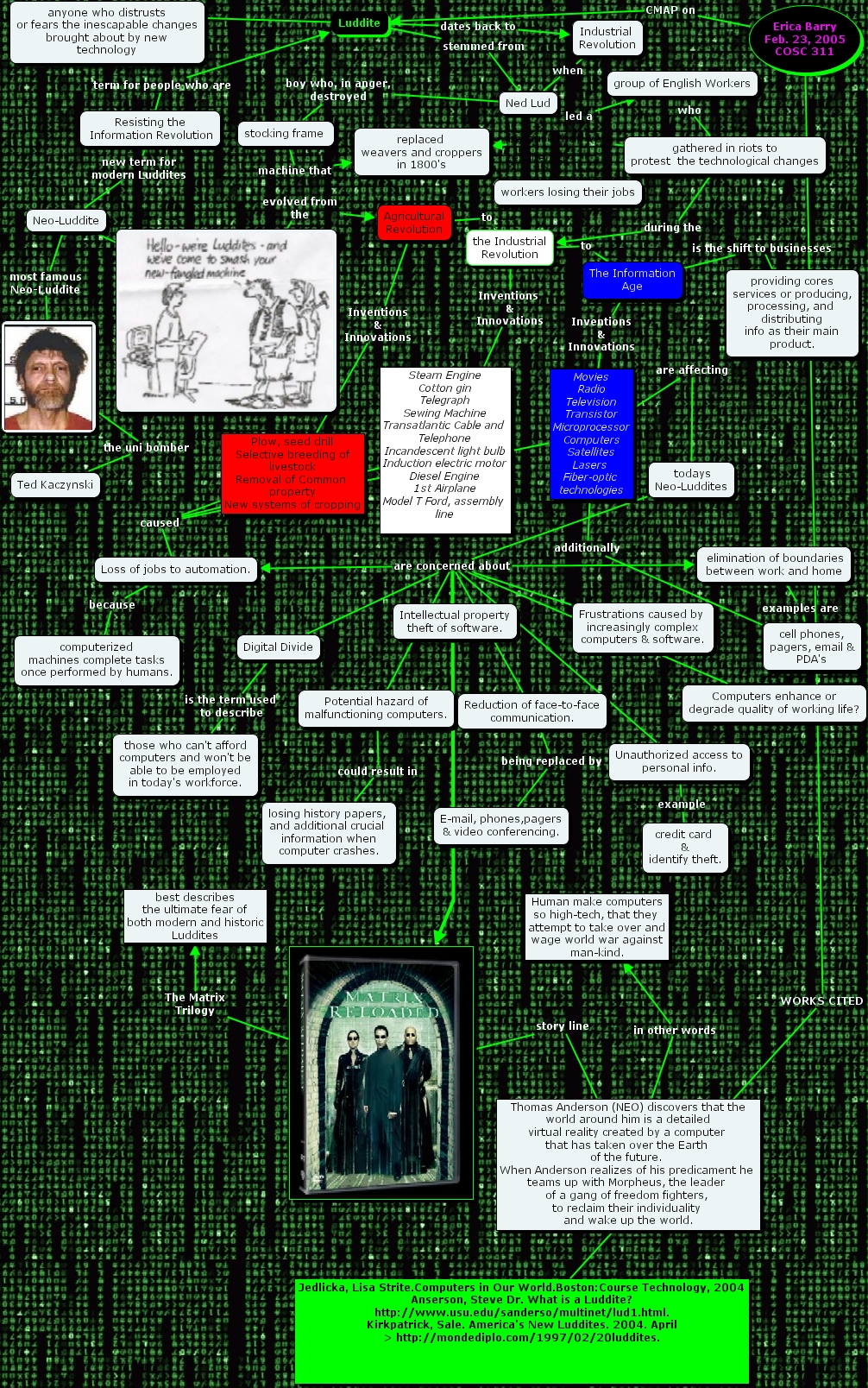 todays Neo-Luddites are concerned about elimination of boundaries between work and home, todays Neo-Luddites are concerned about Potential hazard of malfunctioning computers., todays Neo-Luddites are concerned about Frustrations caused by increasingly complex computers & software., todays Neo-Luddites are concerned about Unauthorized access to personal info., todays Neo-Luddites are concerned about Reduction of face-to-face communication., todays Neo-Luddites are concerned about Loss of jobs to automation., todays Neo-Luddites are concerned about Computers enhance or degrade quality of working life?, todays Neo-Luddites are concerned about Intellectual property theft of software., todays Neo-Luddites are concerned about , todays Neo-Luddites are concerned about Digital Divide, Potential hazard of malfunctioning computers. could result in losing history papers, and additional crucial information when computer crashes., the Industrial Revolution to The Information Age, Neo-Luddite most famous Neo-Luddite , story line Thomas Anderson (NEO) discovers that the world around him is a detailed virtual reality created by a computer that has taken over the Earth of the future. When Anderson realizes of his predicament he teams up with Morpheus, the leader of a gang of freedom fighters, to reclaim their individuality and wake up the world., elimination of boundaries between work and home examples are cell phones, pagers, email & PDA's, The Information Age Inventions & Innovations Movies Radio Television Transistor Microprocessor Computers Satellites Lasers Fiber-optic technologies, the uni bomber Ted Kaczynski, Luddite stemmed from Ned Lud, Unauthorized access to personal info. example credit card & identify theft., Erica Barry Feb. 23, 2005 COSC 311 WORKS CITED Jedlicka, Lisa Strite.Computers in Our World.Boston:Course Technology, 2004 Anserson, Steve Dr. What is a Luddite? http://www.usu.edu/sanderso/multinet/lud1.html. Kirkpatrick, Sale. America's New Luddites. 2004. April > http://mondediplo.com/1997/02/20luddites. , The Matrix Trilogy best describes the ultimate fear of both modern and historic Luddites, gathered in riots to protest the technological changes during the the Industrial Revolution, evolved from the Agricultural Revolution, Agricultural Revolution to the Industrial Revolution, Agricultural Revolution to the Industrial Revolution, Movies Radio Television Transistor Microprocessor Computers Satellites Lasers Fiber-optic technologies are affecting todays Neo-Luddites, group of English Workers who gathered in riots to protest the technological changes, gathered in riots to protest the technological changes because they were replaced weavers and croppers in 1800's, Agricultural Revolution Inventions & Innovations Plow, seed drill Selective breeding of livestock Removal of Common property New systems of cropping, Resisting the Information Revolution new term for modern Luddites Neo-Luddite, Resisting the Information Revolution term for people who are Luddite, Luddite definition anyone who distrusts or fears the inescapable changes brought about by new technology, Loss of jobs to automation. because computerized machines complete tasks once performed by humans., Movies Radio Television Transistor Microprocessor Computers Satellites Lasers Fiber-optic technologies caused Loss of jobs to automation., Plow, seed drill Selective breeding of livestock Removal of Common property New systems of cropping caused Loss of jobs to automation., Industrial Revolution when Ned Lud, The Information Age is the shift to businesses providing cores services or producing, processing, and distributing info as their main product., Thomas Anderson (NEO) discovers that the world around him is a detailed virtual reality created by a computer that has taken over the Earth of the future. When Anderson realizes of his predicament he teams up with Morpheus, the leader of a gang of freedom fighters, to reclaim their individuality and wake up the world. in other words Human make computers so high-tech, that they attempt to take over and wage world war against man-kind., Neo-Luddite ???? , Reduction of face-to-face communication. being replaced by E-mail, phones,pagers & video conferencing., Movies Radio Television Transistor Microprocessor Computers Satellites Lasers Fiber-optic technologies additionally cell phones, pagers, email & PDA's, Erica Barry Feb. 23, 2005 COSC 311 CMAP on Luddite, Luddite dates back to Industrial Revolution, stocking frame machine that replaced weavers and croppers in 1800's, replaced weavers and croppers in 1800's resulted in workers losing their jobs, Ned Lud boy who, in anger, destroyed stocking frame , Ned Lud led a group of English Workers, Steam Engine Cotton gin Telegraph Sewing Machine Transatlantic Cable and Telephone Incandescent light bulb Induction electric motor Diesel Engine 1st Airplane Model T Ford, assembly line caused Loss of jobs to automation., the Industrial Revolution Inventions & Innovations Steam Engine Cotton gin Telegraph Sewing Machine Transatlantic Cable and Telephone Incandescent light bulb Induction electric motor Diesel Engine 1st Airplane Model T Ford, assembly line , Digital Divide is the term used to describe those who can't afford computers and won't be able to be employed in today's workforce.