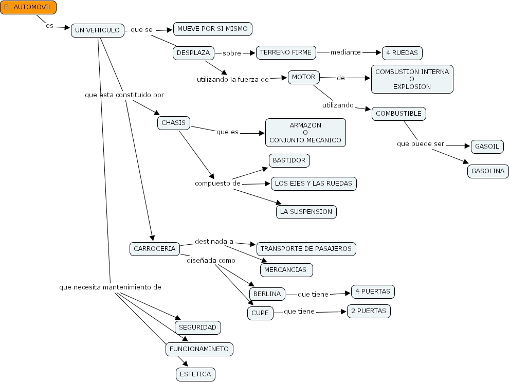 COMBUSTIBLE que puede ser GASOLINA, COMBUSTIBLE que puede ser GASOIL, MOTOR utilizando COMBUSTIBLE, DESPLAZA utilizando la fuerza de MOTOR, UN VEHICULO que esta constituido por CHASIS, UN VEHICULO que esta constituido por CARROCERIA, EL AUTOMOVIL es UN VEHICULO, CUPE que tiene 2 PUERTAS, UN VEHICULO que se MUEVE POR SI MISMO, UN VEHICULO que se DESPLAZA, TERRENO FIRME mediante 4 RUEDAS, CARROCERIA dise�ada como BERLINA, CARROCERIA dise�ada como CUPE, MOTOR de COMBUSTION INTERNA O EXPLOSION, UN VEHICULO que necesita mantenimiento de SEGURIDAD, UN VEHICULO que necesita mantenimiento de FUNCIONAMINETO, UN VEHICULO que necesita mantenimiento de ESTETICA, CHASIS que es ARMAZON O CONJUNTO MECANICO, DESPLAZA sobre TERRENO FIRME, CHASIS compuesto de LA SUSPENSION, CHASIS compuesto de BASTIDOR, CHASIS compuesto de LOS EJES Y LAS RUEDAS, CARROCERIA destinada a TRANSPORTE DE PASAJEROS, CARROCERIA destinada a MERCANCIAS , BERLINA que tiene 4 PUERTAS