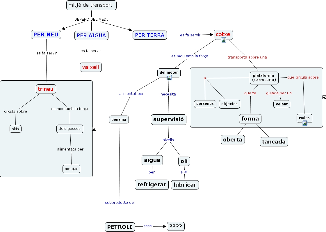 plataforma (carroceria) a objectes, plataforma (carroceria) a persones, mitj� de transport DEPEND DEL MEDI PER AIGUA, mitj� de transport DEPEND DEL MEDI PER TERRA, mitj� de transport DEPEND DEL MEDI PER NEU, trineu es mou amb la for�a dels gossos, aigua per refrigerar, dels gossos alimentats per menjar, forma ???? oberta, supervisi� nivells oli, supervisi� nivells aigua, plataforma (carroceria) que te forma, del motor alimentat per benzina, cotxe transporta sobre una plataforma (carroceria), plataforma (carroceria) guiada per un volant, PER NEU es fa servir trineu, PER TERRA es fa servir cotxe, PER AIGUA es fa servir vaixell, benzina subproducte del PETROLI, cotxe es mou amb la for�a del motor, forma ???? tancada, oli per lubricar, trineu circula sobre skis, del motor necesita supervisi�, PETROLI ???? ????, plataforma (carroceria) que circula sobre rodes