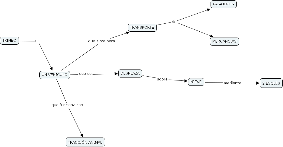 TRINEO es UN VEHICULO, UN VEHICULO que se DESPLAZA, NIEVE mediante 2 ESQU�S, UN VEHICULO que funciona con TRACCI�N ANIMAL, DESPLAZA sobre NIEVE, UN VEHICULO que sirve para TRANSPORTE, TRANSPORTE de MERCANCIAS, TRANSPORTE de PASAJEROS