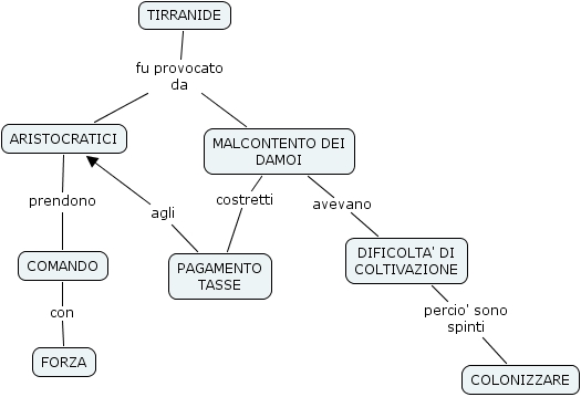 la tirranide, comando, aristocratici, tirranide, forza, pagamento tasse, malcontento dei damoi, dificolta' di coltivazione, colonizzare