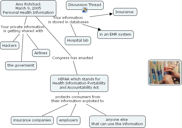 HIPAA which stands for Health Information Portability and Accountability Act protects consumers from their information exploited to insurance companies, HIPAA which stands for Health Information Portability and Accountability Act protects consumers from their information exploited to anyone else that can use the information, HIPAA which stands for Health Information Portability and Accountability Act protects consumers from their information exploited to employers, Amy Rohrback March 9, 2005 Personal Health Information Your private information is getting shared with Hackers, Amy Rohrback March 9, 2005 Personal Health Information Your private information is getting shared with the governemt, Amy Rohrback March 9, 2005 Personal Health Information Your private information is getting shared with Airlines, Amy Rohrback March 9, 2005 Personal Health Information Congress has enacted HIPAA which stands for Health Information Portability and Accountability Act, Amy Rohrback March 9, 2005 Personal Health Information Your information is stored in databases Hospital lab, Amy Rohrback March 9, 2005 Personal Health Information Your information is stored in databases Insurance , Amy Rohrback March 9, 2005 Personal Health Information Your information is stored in databases in an EMR system