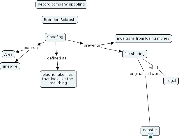 Spoofing occurs in Ares, Spoofing occurs in limewire, file sharing original software napster, file sharing which is illegal, Spoofing defined as placing fake files that look like the real thing, Spoofing prevents musicians from losing money, Spoofing prevents file sharing