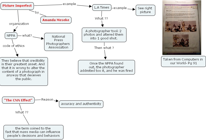 Picture Imperfect organization NPPA, "The CNN Effect" What ?? the term coined to the fact that mass media can influence people�s decisions and behaviors, L.A Times What ?? A photographer took 2 photos and altered them into 1 good shot., "The CNN Effect" Reason accuracy and authenticity, NPPA code of ethics They believe that credibility is their greatest asset. And that it is wrong to alter the content of a photograph in anyway that deceives the public. , Picture Imperfect example L.A Times, NPPA what? National Press Photographers Assosciation, Picture Imperfect by Amanda Meseke, L.A Times example See right picture, A photographer took 2 photos and altered them into 1 good shot. Then what ? Once the NPPA found out, the photographer addmited too it, and he was fired