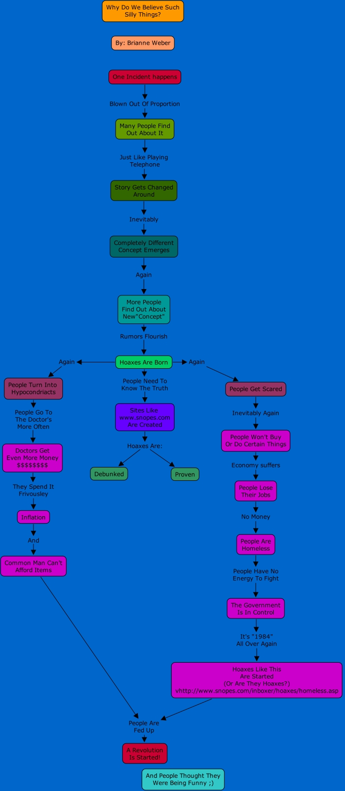 One Incident happens Blown Out Of Proportion Many People Find Out About It, People Lose Their Jobs No Money People Are Homeless, Common Man Can't Afford Items People Are Fed Up A Revolution Is Started!, Hoaxes Are Born Again People Get Scared, Sites Like www.snopes.com Are Created Hoaxes Are: Proven, Sites Like www.snopes.com Are Created Hoaxes Are: Debunked, People Won't Buy Or Do Certain Things Economy suffers People Lose Their Jobs, Inflation And Common Man Can't Afford Items, Hoaxes Like This Are Started (Or Are They Hoaxes?) vhttp://www.snopes.com/inboxer/hoaxes/homeless.asp People Are Fed Up A Revolution Is Started!, The Government Is In Control It's "1984" All Over Again Hoaxes Like This Are Started (Or Are They Hoaxes?) vhttp://www.snopes.com/inboxer/hoaxes/homeless.asp, Doctors Get Even More Money $$$$$$$$ They Spend It Frivousley Inflation, People Are Homeless People Have No Energy To Fight The Government Is In Control, Many People Find Out About It Just Like Playing Telephone Story Gets Changed Around, People Get Scared Inevitably Again People Won't Buy Or Do Certain Things, People Turn Into Hypocondriacts People Go To The Doctor's More Often Doctors Get Even More Money $$$$$$$$, More People Find Out About New"Concept" Rumors Flourish Hoaxes Are Born, Hoaxes Are Born Again People Turn Into Hypocondriacts, Story Gets Changed Around Inevitably Completely Different Concept Emerges, Completely Different Concept Emerges Again More People Find Out About New"Concept", Hoaxes Are Born People Need To Know The Truth Sites Like www.snopes.com Are Created