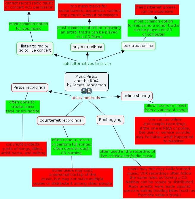Bootlegging often used in the recording of live or televised/radio music users may not copy radio/concert music; VCR recordings often follow the same rules as buying a CD. Neither can be copied or distributed Many arrests were made against persons selling bootleg titles (such as from the seller's trunk), Counterfeit recordings often done to record or perform full songs; often done through CD burning some users may copy a personal backup of the music, but may not make multiple copies or distribute it among other people, Music Piracy and the RIAA by James Henderson piracy methods Pirate recordings, Music Piracy and the RIAA by James Henderson piracy methods Counterfeit recordings , Music Piracy and the RIAA by James Henderson piracy methods online sharing, Music Piracy and the RIAA by James Henderson piracy methods Bootlegging, Music Piracy and the RIAA by James Henderson safe alternatives to piracy buy track online, Music Piracy and the RIAA by James Henderson safe alternatives to piracy buy a CD album, Music Piracy and the RIAA by James Henderson safe alternatives to piracy listen to radio/ go to live concert, buy track online most common option for replaying a song; tracks can be played on CD or computer need internet access, can be expensive, buy a CD album most common option for replaying an artist; tracks can be played on a CD Player too many tracks for some buyers; expensive, cannot copy music without permission, listen to radio/ go to live concert most common option for pop music cannot record radio music or concert w/o permission, online sharing allows users to select from a variety of songs one can go online and sample recordings; if the one is RIAA or police, the user or service provider may be liable--what happened to Napster., Pirate recordings often done to create a mix tape or soundbite copyright protects parts of songs, titles, artist name, and editing