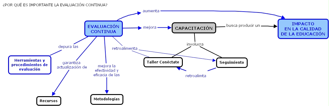 EVALUACI�N CONTINUA mejora CAPACITACI�N, EVALUACI�N CONTINUA depura las Herramientas y procedimientos de evaluaci�n, EVALUACI�N CONTINUA garantiza actualizaci�n de Recursos, EVALUACI�N CONTINUA mejora la efectividad y eficacia de las Metodolog�as, EVALUACI�N CONTINUA retroalimenta Taller Con�ctate, EVALUACI�N CONTINUA retroalimenta Seguimiento, Seguimiento retroalimta Taller Con�ctate, CAPACITACI�N involucra Seguimiento, CAPACITACI�N involucra Taller Con�ctate, CAPACITACI�N busca producir un IMPACTO EN LA CALIDAD DE LA EDUCACI�N, EVALUACI�N CONTINUA aumenta IMPACTO EN LA CALIDAD DE LA EDUCACI�N