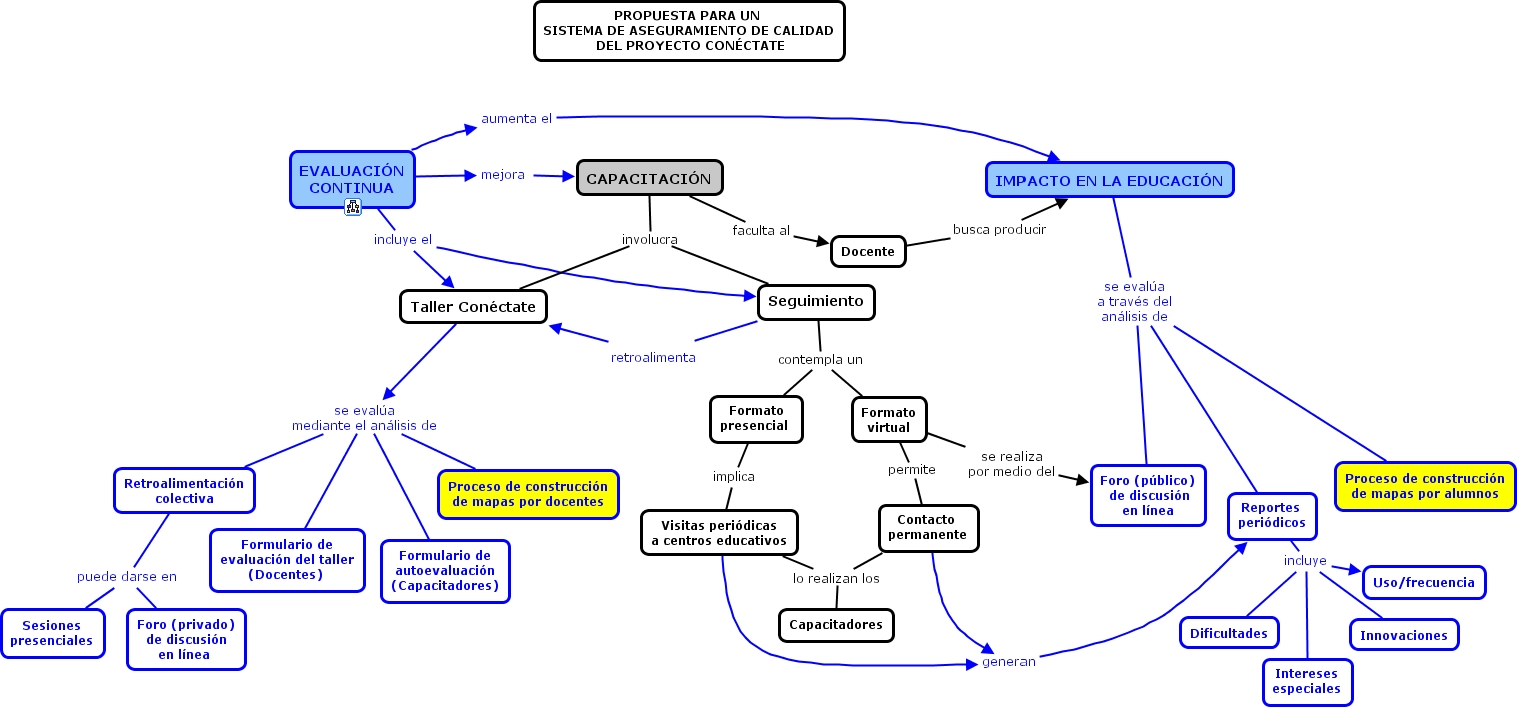 Seguimiento contempla un Formato virtual, Seguimiento contempla un Formato presencial, Taller Con�ctate se eval�a mediante el an�lisis de Retroalimentaci�n colectiva, Taller Con�ctate se eval�a mediante el an�lisis de Proceso de construcci�n de mapas por docentes, Taller Con�ctate se eval�a mediante el an�lisis de Formulario de autoevaluaci�n (Capacitadores), Taller Con�ctate se eval�a mediante el an�lisis de Formulario de evaluaci�n del taller (Docentes), EVALUACI�N CONTINUA incluye el Taller Con�ctate, EVALUACI�N CONTINUA incluye el Seguimiento, EVALUACI�N CONTINUA mejora CAPACITACI�N, CAPACITACI�N involucra Taller Con�ctate, CAPACITACI�N involucra Seguimiento, Reportes peri�dicos incluye Dificultades, Reportes peri�dicos incluye Uso/frecuencia, Reportes peri�dicos incluye Innovaciones, Reportes peri�dicos incluye Intereses especiales, Formato virtual se realiza por medio del Foro (p�blico) de discusi�n en l�nea, EVALUACI�N CONTINUA aumenta el IMPACTO EN LA EDUCACI�N, Docente busca producir IMPACTO EN LA EDUCACI�N, CAPACITACI�N faculta al Docente, Contacto permanente generan Reportes peri�dicos, Visitas peri�dicas a centros educativos generan Reportes peri�dicos, Contacto permanente lo realizan los Capacitadores, Formato presencial implica Visitas peri�dicas a centros educativos, Visitas peri�dicas a centros educativos lo realizan los Capacitadores, Seguimiento retroalimenta Taller Con�ctate, Retroalimentaci�n colectiva puede darse en Sesiones presenciales, Retroalimentaci�n colectiva puede darse en Foro (privado) de discusi�n en l�nea, IMPACTO EN LA EDUCACI�N se eval�a a trav�s del an�lisis de Foro (p�blico) de discusi�n en l�nea, IMPACTO EN LA EDUCACI�N se eval�a a trav�s del an�lisis de Proceso de construcci�n de mapas por alumnos, IMPACTO EN LA EDUCACI�N se eval�a a trav�s del an�lisis de Reportes peri�dicos, Formato virtual permite Contacto permanente