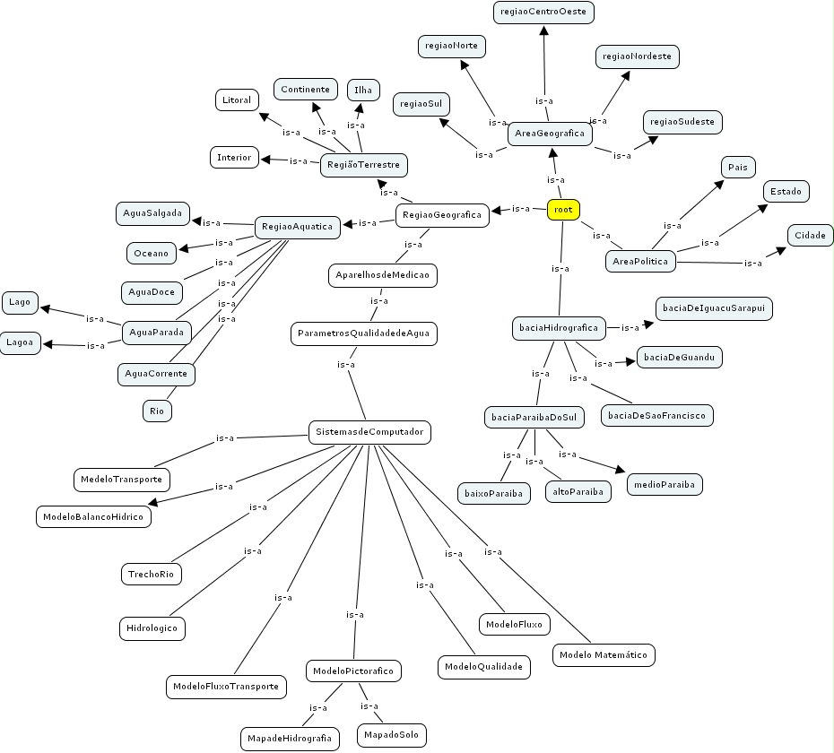 baciaHidrografica is-a baciaParaibaDoSul, AreaGeografica is-a regiaoNordeste, AreaGeografica is-a regiaoNorte, RegiaoGeografica is-a RegiaoAquatica, ModeloPictorafico is-a MapadeHidrografia, baciaParaibaDoSul is-a altoParaiba, AguaParada is-a Lagoa, SistemasdeComputador is-a TrechoRio, Regi�oTerrestre is-a Interior, RegiaoAquatica is-a AguaSalgada, RegiaoGeografica is-a Regi�oTerrestre, Regi�oTerrestre is-a Ilha, SistemasdeComputador is-a ModeloFluxo, AreaGeografica is-a regiaoCentroOeste, SistemasdeComputador is-a ModeloPictorafico, AreaGeografica is-a regiaoSudeste, AreaGeografica is-a regiaoSul, SistemasdeComputador is-a ModeloFluxoTransporte, SistemasdeComputador is-a Modelo Matem�tico, baciaParaibaDoSul is-a baixoParaiba, RegiaoAquatica is-a AguaDoce, RegiaoAquatica is-a AguaParada, Regi�oTerrestre is-a Continente, root is-a AreaGeografica, baciaParaibaDoSul is-a medioParaiba, AreaPolitica is-a Cidade, ParametrosQualidadedeAgua is-a SistemasdeComputador, root is-a baciaHidrografica, AreaPolitica is-a Estado, root is-a AreaPolitica, RegiaoAquatica is-a AguaCorrente, SistemasdeComputador is-a ModeloQualidade, root is-a RegiaoGeografica, SistemasdeComputador is-a MedeloTransporte, SistemasdeComputador is-a ModeloBalancoHidrico, AguaParada is-a Lago, baciaHidrografica is-a baciaDeGuandu, AreaPolitica is-a Pais, baciaHidrografica is-a baciaDeSaoFrancisco, RegiaoAquatica is-a Rio, Regi�oTerrestre is-a Litoral, RegiaoGeografica is-a AparelhosdeMedicao, ModeloPictorafico is-a MapadoSolo, RegiaoAquatica is-a Oceano, SistemasdeComputador is-a Hidrologico, AparelhosdeMedicao is-a ParametrosQualidadedeAgua, baciaHidrografica is-a baciaDeIguacuSarapui