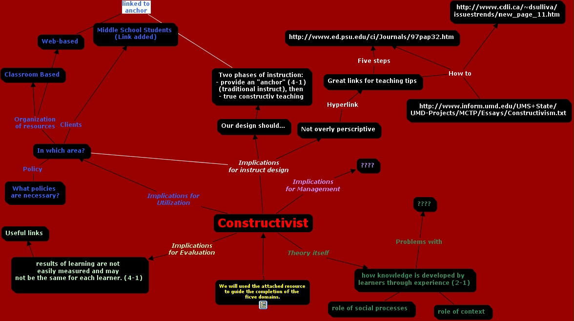 Constructivist Implications for Evaluation results of learning are not easily measured and may not be the same for each learner. (4-1) , Great links for teaching tips How to http://www.cdli.ca/~dsulliva/ issuestrends/new_page_11.htm, Great links for teaching tips How to http://www.inform.umd.edu/UMS+State/ UMD-Projects/MCTP/Essays/Constructivism.txt, Great links for teaching tips How to http://www.ed.psu.edu/ci/Journals/97pap32.htm, Not overly perscriptive Hyperlink Great links for teaching tips, In which area? Policy What policies are necessary?, how knowledge is developed by learners through experience (2-1) ???? role of social processes , Web-based linked to anchor Two phases of instruction: - provide an "anchor" (4-1) (traditional instruct), then - true constructiv teaching, In which area? Clients Middle School Students (Link added), Constructivist Implications for instruct design Not overly perscriptive, Constructivist Implications for instruct design Our design should..., We will used the attached resource to guide the completion of the ficve domains. 1 Constructivist, In which area? Organization of resources Classroom Based, In which area? Organization of resources Web-based, how knowledge is developed by learners through experience (2-1) Problems with ????, Constructivist Implications for Utilization In which area?, Our design should... ???? Two phases of instruction: - provide an "anchor" (4-1) (traditional instruct), then - true constructiv teaching, Constructivist Theory itself how knowledge is developed by learners through experience (2-1), Constructivist Implications for Management ????, results of learning are not easily measured and may not be the same for each learner. (4-1) ???? Useful links, In which area? Implications for instruct design Not overly perscriptive, In which area? Implications for instruct design Our design should..., how knowledge is developed by learners through experience (2-1) ???? role of context , Great links for teaching tips Five steps http://www.ed.psu.edu/ci/Journals/97pap32.htm