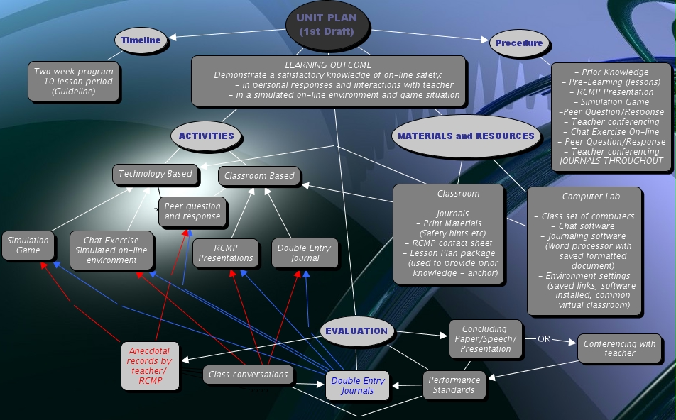 Simulation Game ???? Technology Based, Chat Exercise Simulated on-line environment ???? Technology Based, ACTIVITIES ???? Technology Based, Conferencing with teacher ???? Performance Standards, EVALUATION ???? Performance Standards, Double Entry Journals ???? Chat Exercise Simulated on-line environment, EVALUATION ???? Double Entry Journals, Anecdotal records by teacher/ RCMP ???? Chat Exercise Simulated on-line environment, Classroom Based ???? Peer question and response, Procedure ???? - Prior Knowledge - Pre-Learning (lessons) - RCMP Presentation - Simulation Game -Peer Question/Response - Teacher conferencing - Chat Exercise On-line - Peer Question/Response - Teacher conferencing JOURNALS THROUGHOUT, LEARNING OUTCOME Demonstrate a satisfactory knowledge of on-line safety: - in personal responses and interactions with teacher - in a simulated on-line environment and game situation ???? EVALUATION, Anecdotal records by teacher/ RCMP Peer question and response, Timeline ???? Two week program - 10 lesson period (Guideline), UNIT PLAN (1st Draft) ???? LEARNING OUTCOME Demonstrate a satisfactory knowledge of on-line safety: - in personal responses and interactions with teacher - in a simulated on-line environment and game situation, Concluding Paper/Speech/ Presentation OR Conferencing with teacher, Technology Based ???? Peer question and response, Anecdotal records by teacher/ RCMP ???? Double Entry Journals, Anecdotal records by teacher/ RCMP ???? Double Entry Journal, Classroom - Journals - Print Materials (Safety hints etc) - RCMP contact sheet - Lesson Plan package (used to provide prior knowledge - anchor) ???? Classroom Based, MATERIALS and RESOURCES ???? Classroom - Journals - Print Materials (Safety hints etc) - RCMP contact sheet - Lesson Plan package (used to provide prior knowledge - anchor), Anecdotal records by teacher/ RCMP ???? RCMP Presentations, Performance Standards , RCMP Presentations ???? Classroom Based, Double Entry Journals Simulation Game, UNIT PLAN (1st Draft) ???? Timeline, Computer Lab - Class set of computers - Chat software - Journaling software (Word processor with saved formatted document) - Environment settings (saved links, software installed, common virtual classroom) Technology Based, Double Entry Journal ???? Classroom Based, Double Entry Journals ???? RCMP Presentations, UNIT PLAN (1st Draft) ???? Procedure, ACTIVITIES ???? Classroom Based, MATERIALS and RESOURCES ???? Computer Lab - Class set of computers - Chat software - Journaling software (Word processor with saved formatted document) - Environment settings (saved links, software installed, common virtual classroom), Concluding Paper/Speech/ Presentation ???? Performance Standards, Double Entry Journals Peer question and response, UNIT PLAN (1st Draft) ???? ACTIVITIES, Double Entry Journals Double Entry Journal, Anecdotal records by teacher/ RCMP Simulation Game, Performance Standards ???? Double Entry Journals, EVALUATION ???? Anecdotal records by teacher/ RCMP, UNIT PLAN (1st Draft) ???? MATERIALS and RESOURCES, Anecdotal records by teacher/ RCMP ???? Class conversations, EVALUATION ???? Concluding Paper/Speech/ Presentation