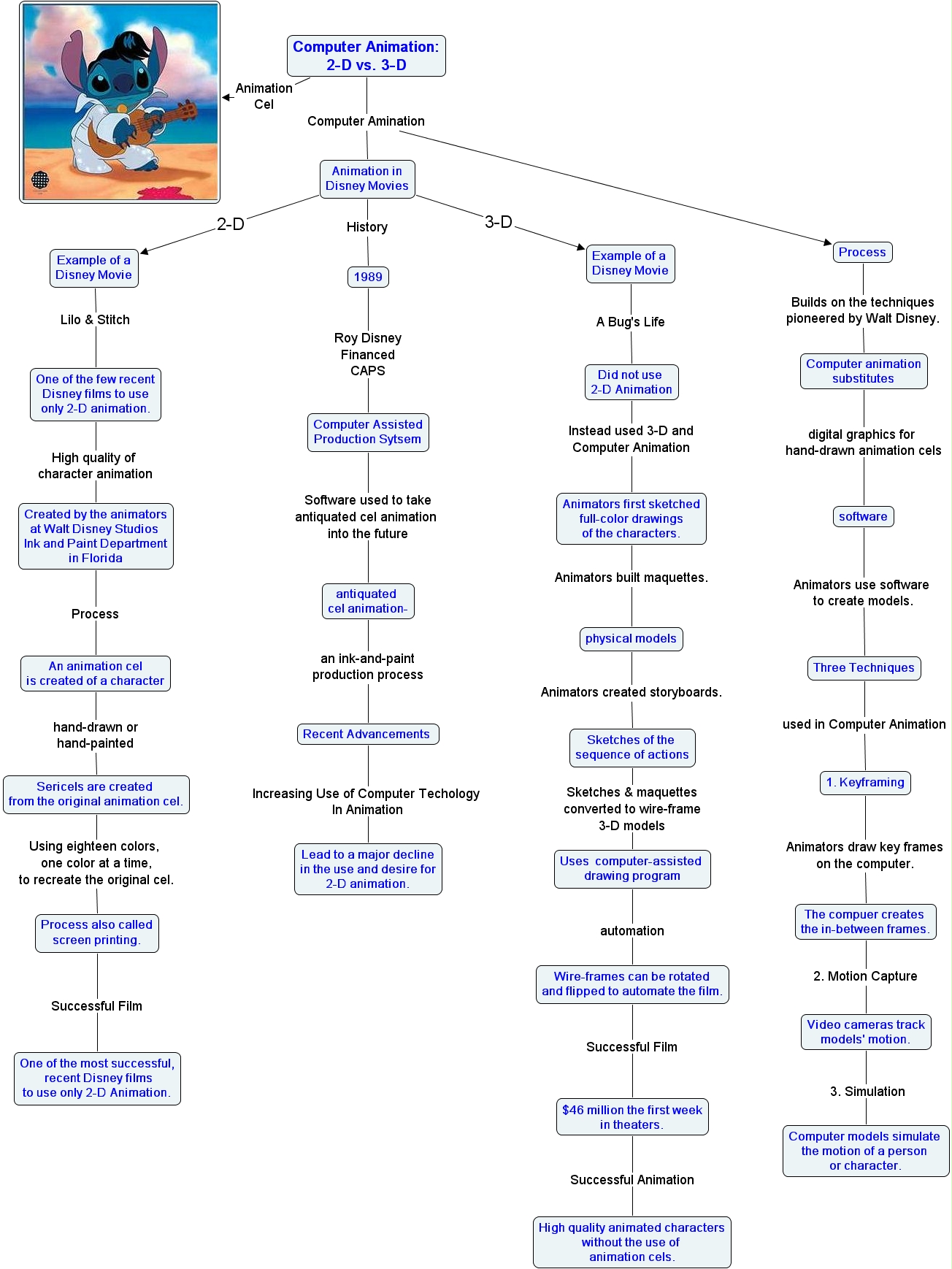 Animation in Disney Movies 2-D Example of a Disney Movie, The compuer creates the in-between frames. 2. Motion Capture Video cameras track models' motion., $46 million the first week in theaters. Successful Animation High quality animated characters without the use of animation cels., One of the few recent Disney films to use only 2-D animation. High quality of character animation Created by the animators at Walt Disney Studios Ink and Paint Department in Florida, software Animators use software to create models. Three Techniques, Process also called screen printing. Successful Film One of the most successful, recent Disney films to use only 2-D Animation., Sericels are created from the original animation cel. Using eighteen colors, one color at a time, to recreate the original cel. Process also called screen printing., Created by the animators at Walt Disney Studios Ink and Paint Department in Florida Process An animation cel is created of a character, Sketches of the sequence of actions Sketches & maquettes converted to wire-frame 3-D models Uses computer-assisted drawing program, Process Builds on the techniques pioneered by Walt Disney. Computer animation substitutes, Uses computer-assisted drawing program automation Wire-frames can be rotated and flipped to automate the film., Wire-frames can be rotated and flipped to automate the film. Successful Film $46 million the first week in theaters., Three Techniques used in Computer Animation 1. Keyframing, Example of a Disney Movie Lilo & Stitch One of the few recent Disney films to use only 2-D animation., Computer Animation: 2-D vs. 3-D Animation Cel , Recent Advancements Increasing Use of Computer Techology In Animation Lead to a major decline in the use and desire for 2-D animation., Did not use 2-D Animation Instead used 3-D and Computer Animation Animators first sketched full-color drawings of the characters., Animators first sketched full-color drawings of the characters. Animators built maquettes. physical models, Animation in Disney Movies History 1989, An animation cel is created of a character hand-drawn or hand-painted Sericels are created from the original animation cel., Video cameras track models' motion. 3. Simulation Computer models simulate the motion of a person or character., Computer animation substitutes digital graphics for hand-drawn animation cels software, Example of a Disney Movie A Bug's Life Did not use 2-D Animation, 1989 Roy Disney Financed CAPS Computer Assisted Production Sytsem, Computer Assisted Production Sytsem Software used to take antiquated cel animation into the future antiquated cel animation-, 1. Keyframing Animators draw key frames on the computer. The compuer creates the in-between frames., antiquated cel animation- an ink-and-paint production process Recent Advancements , Computer Animation: 2-D vs. 3-D Computer Amination Process, Computer Animation: 2-D vs. 3-D Computer Amination Animation in Disney Movies, physical models Animators created storyboards. Sketches of the sequence of actions, Animation in Disney Movies 3-D Example of a Disney Movie