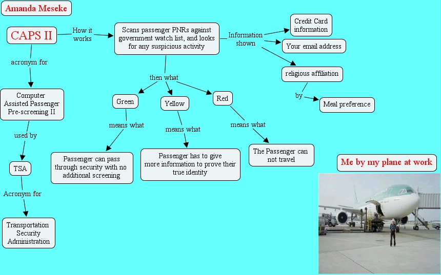 CAPS II How it works Scans passenger PNRs against government watch list, and looks for any suspicious activity, Scans passenger PNRs against government watch list, and looks for any suspicious activity Information shown Credit Card information, Scans passenger PNRs against government watch list, and looks for any suspicious activity Information shown religious affiliation, Scans passenger PNRs against government watch list, and looks for any suspicious activity Information shown Your email address, religious affiliation by Meal preference, Green means what Passenger can pass through security with no additional screening, Computer Assisted Passenger Pre-screening II used by TSA, Red means what The Passenger can not travel, Yellow means what Passenger has to give more information to prove their true identity, CAPS II acronym for Computer Assisted Passenger Pre-screening II, Scans passenger PNRs against government watch list, and looks for any suspicious activity then what Yellow, Scans passenger PNRs against government watch list, and looks for any suspicious activity then what Red, Scans passenger PNRs against government watch list, and looks for any suspicious activity then what Green, TSA Acronym for Transportation Security Administration