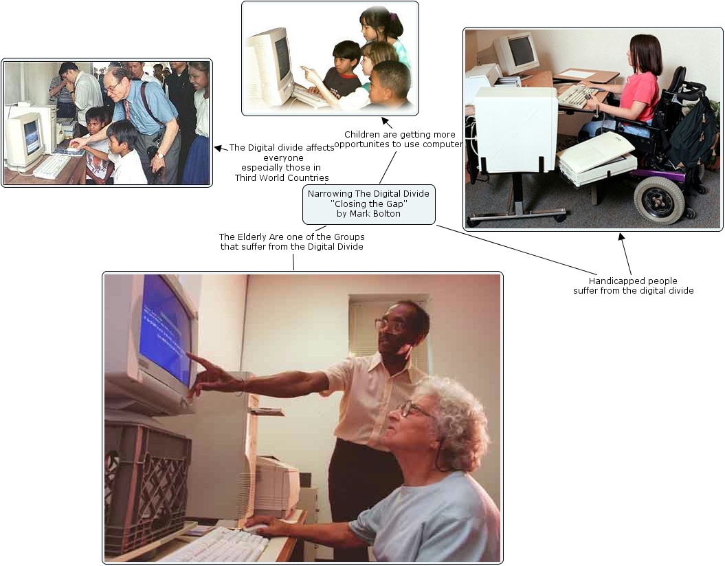 Narrowing The Digital Divide "Closing the Gap" by Mark Bolton The Digital divide affects everyone especially those in Third World Countries , Narrowing The Digital Divide "Closing the Gap" by Mark Bolton Children are getting more opportunites to use computers , Narrowing The Digital Divide "Closing the Gap" by Mark Bolton The Elderly Are one of the Groups that suffer from the Digital Divide , Narrowing The Digital Divide "Closing the Gap" by Mark Bolton Handicapped people suffer from the digital divide