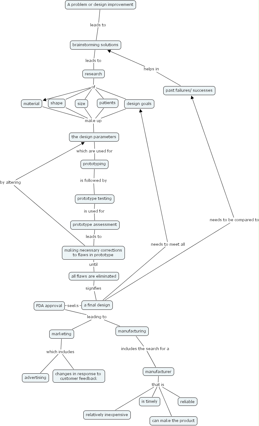 past failures/ successes helps in brainstorming solutions, manufacturing includes the search for a manufacturer, a final design seeks FDA approval, prototyping is followed by prototype testing, marketing which includes changes in response to customer feedback, marketing which includes advertising, making necessary corrections to flaws in prototype until all flaws are eliminated, material make up the design parameters, a final design needs to be compared to past failures/ successes, all flaws are eliminated signifies a final design, patients make up the design parameters, FDA approval leading to manufacturing, FDA approval leading to marketing, the design parameters which are used for prototyping, research of size, research of design goals, research of material, research of patients, research of shape, shape make up the design parameters, size make up the design parameters, design goals make up the design parameters, manufacturer that is reliable, manufacturer that is relatively inexpensive, manufacturer that is can make the product, manufacturer that is is timely, A problem or design improvement leads to brainstorming solutions, making necessary corrections to flaws in prototype by altering the design parameters, prototype testing is used for prototype assessment, a final design needs to meet all design goals, brainstorming solutions leads to research, prototype assessment leads to making necessary corrections to flaws in prototype