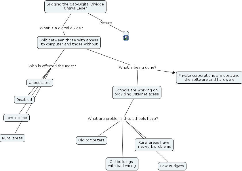 Bridging the Gap-Digital Dividge Chaya Leder Picture , Split between those with access to computer and those without Who is affected the most? Low income, Split between those with access to computer and those without Who is affected the most? Disabled, Split between those with access to computer and those without Who is affected the most? Uneducated, Split between those with access to computer and those without Who is affected the most? Rural areas, Bridging the Gap-Digital Dividge Chaya Leder What is a digital divide? Split between those with access to computer and those without, Schools are working on providing Internet acess What are problems that schools have? Low Budgets, Schools are working on providing Internet acess What are problems that schools have? Old buildings with bad wiring, Schools are working on providing Internet acess What are problems that schools have? Old computers, Schools are working on providing Internet acess What are problems that schools have? Rural areas have network problems, Split between those with access to computer and those without What is being done? Schools are working on providing Internet acess, Split between those with access to computer and those without What is being done? Private corporations are donating the software and hardware