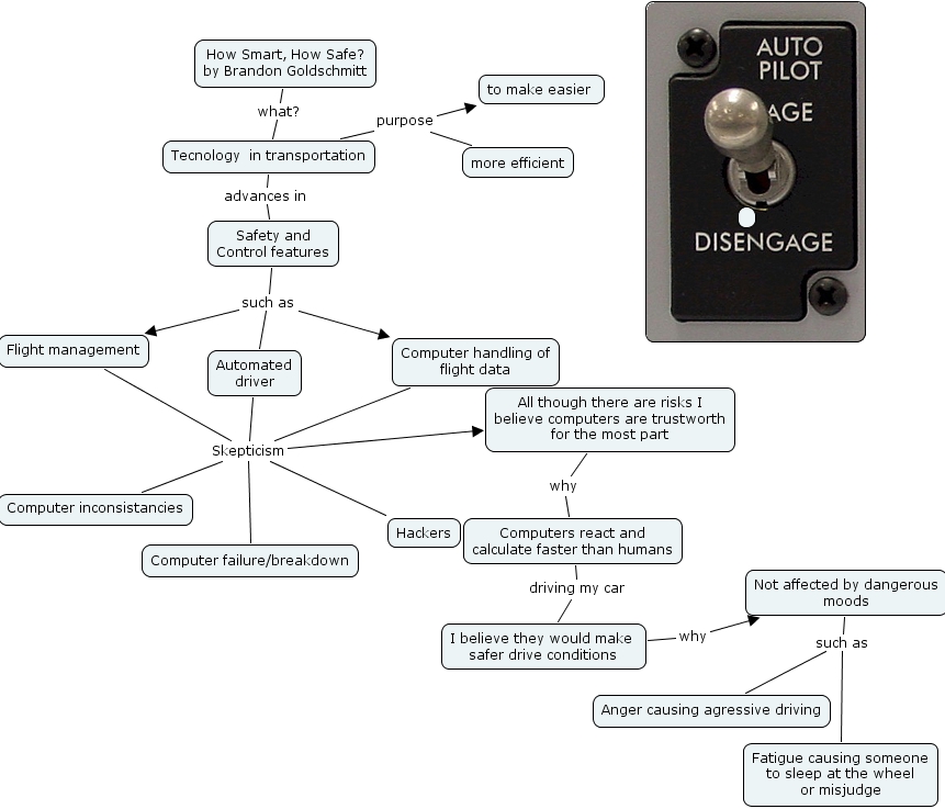 Not affected by dangerous moods such as Anger causing agressive driving, Not affected by dangerous moods such as Fatigue causing someone to sleep at the wheel or misjudge, Safety and Control features such as Automated driver, Safety and Control features such as Computer handling of flight data, Safety and Control features such as Flight management, All though there are risks I believe computers are trustworth for the most part why Computers react and calculate faster than humans, I believe they would make safer drive conditions why Not affected by dangerous moods, Flight management Skepticism Hackers, Flight management Skepticism Computer failure/breakdown, Flight management Skepticism All though there are risks I believe computers are trustworth for the most part, Flight management Skepticism Computer inconsistancies, Tecnology in transportation purpose more efficient, Tecnology in transportation purpose to make easier , Computer handling of flight data Skepticism Hackers, Computer handling of flight data Skepticism Computer failure/breakdown, Computer handling of flight data Skepticism All though there are risks I believe computers are trustworth for the most part, Computer handling of flight data Skepticism Computer inconsistancies, Computers react and calculate faster than humans driving my car I believe they would make safer drive conditions, How Smart, How Safe? by Brandon Goldschmitt what? Tecnology in transportation, Automated driver Skepticism Hackers, Automated driver Skepticism Computer failure/breakdown, Automated driver Skepticism All though there are risks I believe computers are trustworth for the most part, Automated driver Skepticism Computer inconsistancies, Tecnology in transportation advances in Safety and Control features