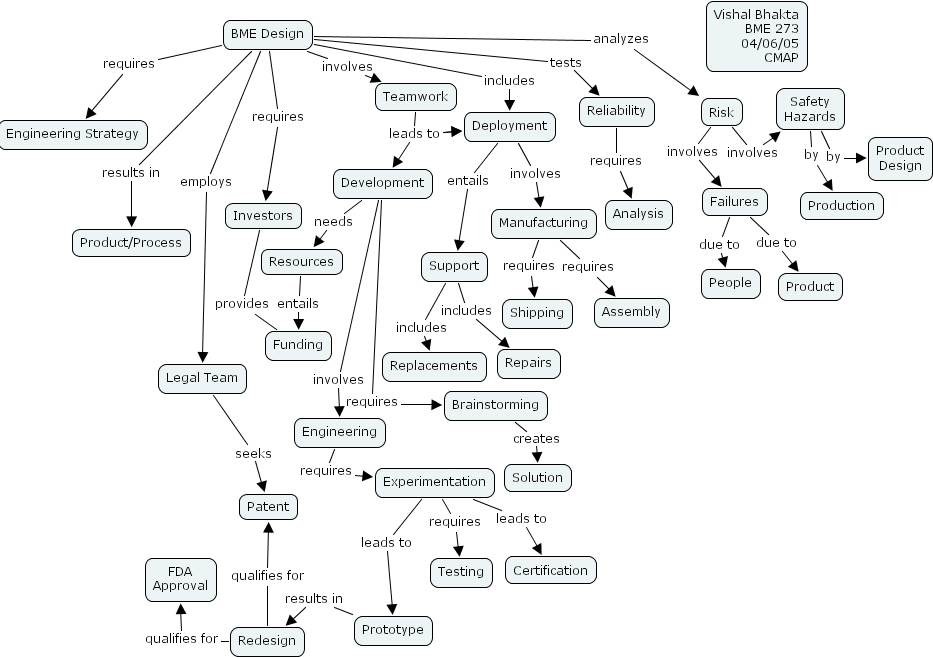 Failures due to Product, Support includes Repairs, Brainstorming creates Solution, Prototype results in Redesign, Risk involves Safety Hazards, Risk involves Failures, Experimentation requires Testing, BME Design requires Engineering Strategy, Development requires Brainstorming, Experimentation leads to Certification, Deployment involves Manufacturing, Resources entails Funding, BME Design analyzes Risk, Safety Hazards by Product Design, Reliability requires Analysis, Experimentation leads to Prototype, Legal Team seeks Patent, Redesign qualifies for FDA Approval, BME Design employs Legal Team, Teamwork leads to Deployment, Teamwork leads to Deployment, Teamwork leads to Development, Manufacturing requires Assembly, Development involves Engineering, Manufacturing requires Shipping, BME Design includes Deployment, Support includes Replacements, Development needs Resources, BME Design requires Investors, BME Design results in Product/Process, Investors provides Funding, Engineering requires Experimentation, BME Design tests Reliability, Safety Hazards by Production, BME Design involves Teamwork, Failures due to People, Redesign qualifies for Patent, Deployment entails Support
