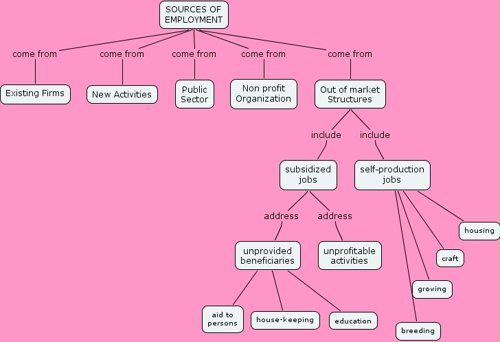 SOURCES OF EMPLOYMENT come from Out of market Structures, Out of market Structures include self-production jobs, Out of market Structures include subsidized jobs, subsidized jobs address unprofitable activities, subsidized jobs address unprovided beneficiaries, SOURCES OF EMPLOYMENT come from Public Sector, SOURCES OF EMPLOYMENT come from Existing Firms, SOURCES OF EMPLOYMENT come from New Activities, SOURCES OF EMPLOYMENT come from Non profit Organization