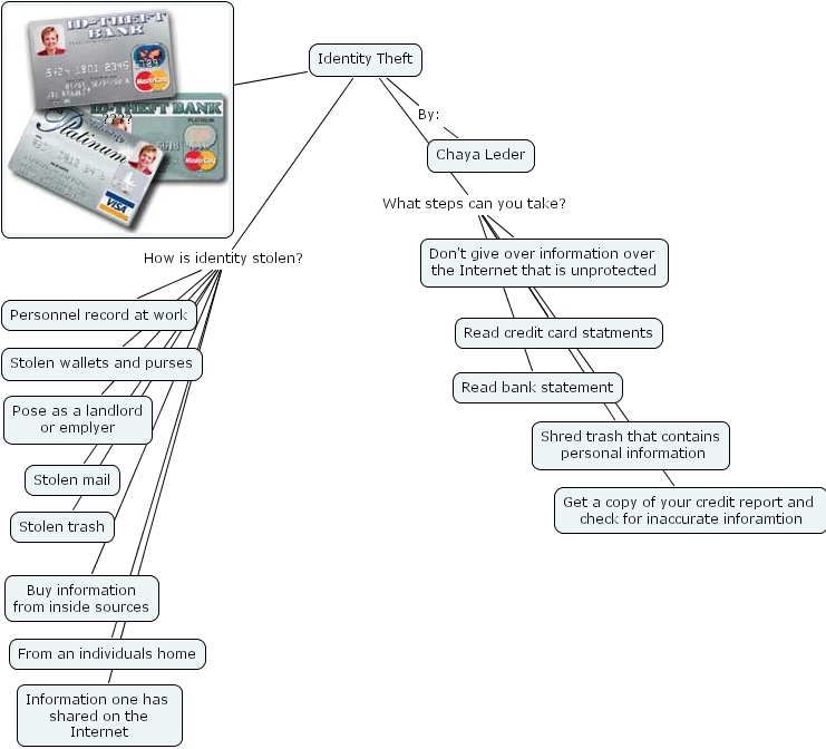 Identity Theft By: Chaya Leder, Identity Theft How is identity stolen? Buy information from inside sources, Identity Theft How is identity stolen? Personnel record at work, Identity Theft How is identity stolen? Stolen trash, Identity Theft How is identity stolen? Information one has shared on the Internet, Identity Theft How is identity stolen? Stolen mail, Identity Theft How is identity stolen? Pose as a landlord or emplyer, Identity Theft How is identity stolen? From an individuals home, Identity Theft How is identity stolen? Stolen wallets and purses, Identity Theft What steps can you take? Shred trash that contains personal information, Identity Theft What steps can you take? Don't give over information over the Internet that is unprotected, Identity Theft What steps can you take? Read bank statement, Identity Theft What steps can you take? Get a copy of your credit report and check for inaccurate inforamtion, Identity Theft What steps can you take? Read credit card statments, Identity Theft Pic ????