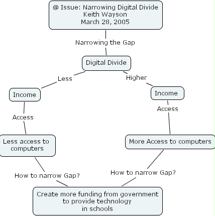 Digital Divide Higher Income , Income Access Less access to computers, Digital Divide Less Income, Less access to computers How to narrow Gap? Create more funding from government to provide technology in schools, More Access to computers How to narrow Gap? Create more funding from government to provide technology in schools, @ Issue: Narrowing Digital Divide Keith Wayson March 28, 2005 Narrowing the Gap Digital Divide, Income Access More Access to computers
