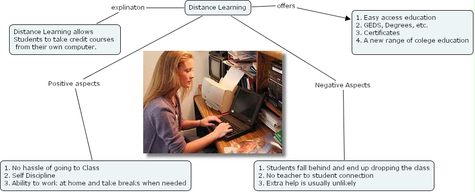 Distance Learning Negative Aspects 1. Students fall behind and end up dropping the class 2. No teacher to student connection 3. Extra help is usually unlikely, Distance Learning Positive aspects 1. No hassle of going to Class 2. Self Discipline 3. Ability to work at home and take breaks when needed, Distance Learning explinaton Distance Learning allows Students to take credit courses from their own computer., Distance Learning offers 1. Easy access education 2. GEDS, Degrees, etc. 3. Certificates 4. A new range of colege education