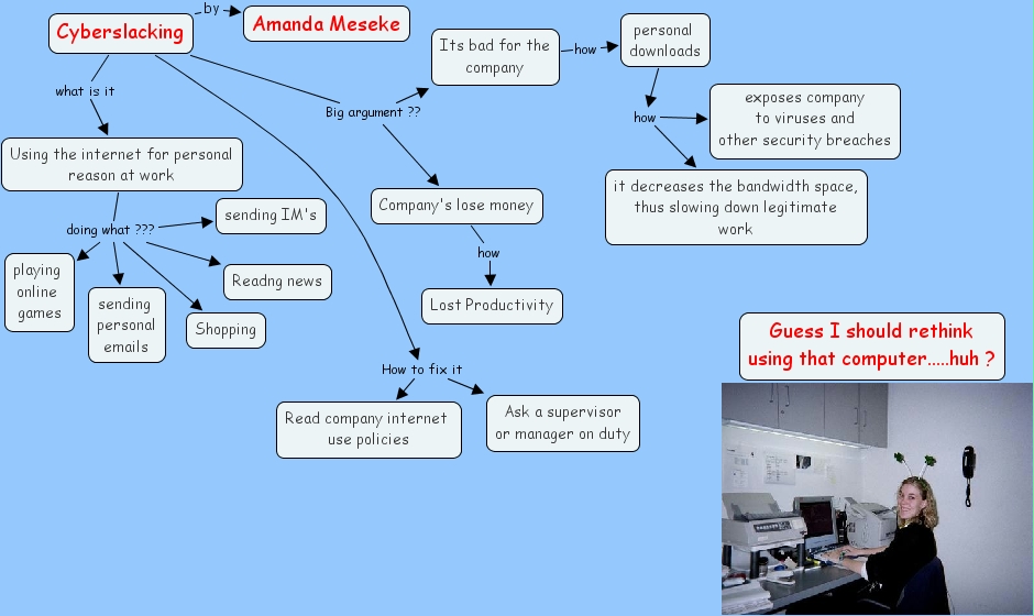 Cyberslacking Big argument ?? Its bad for the company, Cyberslacking Big argument ?? Company's lose money, Cyberslacking How to fix it Ask a supervisor or manager on duty, Cyberslacking How to fix it Read company internet use policies, Cyberslacking by Amanda Meseke, Using the internet for personal reason at work doing what ??? Readng news, Using the internet for personal reason at work doing what ??? Shopping, Using the internet for personal reason at work doing what ??? sending IM's, Using the internet for personal reason at work doing what ??? playing online games, Using the internet for personal reason at work doing what ??? sending personal emails, Its bad for the company how personal downloads, Cyberslacking what is it Using the internet for personal reason at work, Company's lose money how Lost Productivity, personal downloads how exposes company to viruses and other security breaches, personal downloads how it decreases the bandwidth space, thus slowing down legitimate work