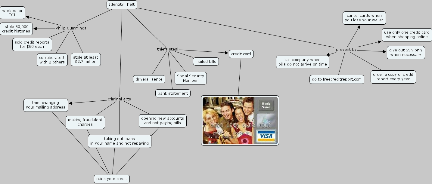 credit card ???? , taking out loans in your name and not repaying ???? ruins your credit, opening new accounts and not paying bills ???? ruins your credit, thief changing your mailing address ???? ruins your credit, Identity Theft Philip Cummings stole at least $2.7 million, Identity Theft Philip Cummings sold credit reports for $60 each, Identity Theft Philip Cummings corraborated with 2 others, Identity Theft Philip Cummings worked for TCI, Identity Theft Philip Cummings stole 30,000 credit histories, Identity Theft Philip Cummings stole 30,000 credit histories, Identity Theft thiefs steal mailed bills, Identity Theft thiefs steal Social Security Number, Identity Theft thiefs steal credit card, Identity Theft thiefs steal bank statement, Identity Theft thiefs steal drivers lisence, Identity Theft criminal acts taking out loans in your name and not repaying, Identity Theft criminal acts thief changing your mailing address, Identity Theft criminal acts making fraudulent charges, Identity Theft criminal acts opening new accounts and not paying bills, Identity Theft prevent by use only one credit card when shopping online, Identity Theft prevent by call company when bills do not arrive on time, Identity Theft prevent by order a copy of credit report every year, Identity Theft prevent by give out SSN only when necessary, Identity Theft prevent by cancel cards when you lose your wallet, Identity Theft prevent by go to freecreditreport.com, making fraudulent charges ???? ruins your credit