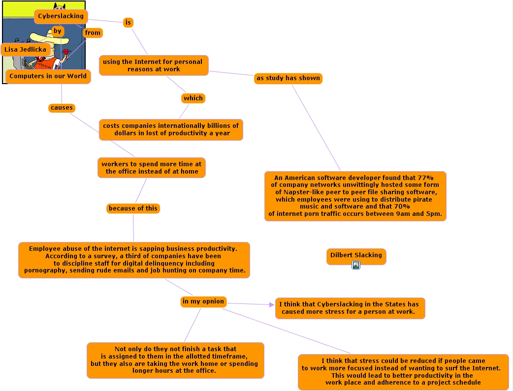 using the Internet for personal reasons at work as study has shown An American software developer found that 77% of company networks unwittingly hosted some form of Napster-like peer to peer file sharing software, which employees were using to distribute pirate music and software and that 70% of internet porn traffic occurs between 9am and 5pm., Cyberslacking from Computers in our World, Cyberslacking is using the Internet for personal reasons at work, using the Internet for personal reasons at work which costs companies internationally billions of dollars in lost of productivity a year, Cyberslacking causes workers to spend more time at the office instead of at home, Employee abuse of the internet is sapping business productivity. According to a survey, a third of companies have been to discipline staff for digital delinquency including pornography, sending rude emails and job hunting on company time. in my opnion I think that stress could be reduced if people came to work more focused instead of wanting to surf the Internet. This would lead to better productivity in the work place and adherence to a project schedule, Employee abuse of the internet is sapping business productivity. According to a survey, a third of companies have been to discipline staff for digital delinquency including pornography, sending rude emails and job hunting on company time. in my opnion I think that Cyberslacking in the States has caused more stress for a person at work. , Employee abuse of the internet is sapping business productivity. According to a survey, a third of companies have been to discipline staff for digital delinquency including pornography, sending rude emails and job hunting on company time. in my opnion Not only do they not finish a task that is assigned to them in the allotted timeframe, but they also are taking the work home or spending longer hours at the office. , workers to spend more time at the office instead of at home because of this Employee abuse of the internet is sapping business productivity. According to a survey, a third of companies have been to discipline staff for digital delinquency including pornography, sending rude emails and job hunting on company time., Cyberslacking by Lisa Jedlicka