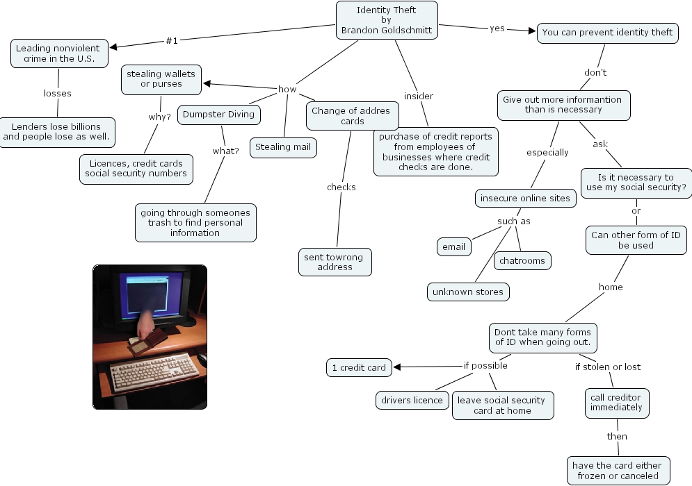 Give out more informantion than is necessary ask Is it necessary to use my social security?, Dumpster Diving what? going through someones trash to find personal information, stealing wallets or purses why? Licences, credit cards social security numbers, Identity Theft by Brandon Goldschmitt #1 Leading nonviolent crime in the U.S., call creditor immediately then have the card either frozen or canceled, Identity Theft by Brandon Goldschmitt yes You can prevent identity theft, Give out more informantion than is necessary especially insecure online sites, Change of addres cards checks sent towrong address, insecure online sites such as unknown stores, insecure online sites such as chatrooms, insecure online sites such as email, Identity Theft by Brandon Goldschmitt how stealing wallets or purses, Identity Theft by Brandon Goldschmitt how Change of addres cards, Identity Theft by Brandon Goldschmitt how Stealing mail, Identity Theft by Brandon Goldschmitt how Dumpster Diving, You can prevent identity theft don't Give out more informantion than is necessary, Can other form of ID be used home Dont take many forms of ID when going out., Dont take many forms of ID when going out. if stolen or lost call creditor immediately, Is it necessary to use my social security? or Can other form of ID be used, Dont take many forms of ID when going out. if possible 1 credit card, Dont take many forms of ID when going out. if possible drivers licence, Dont take many forms of ID when going out. if possible leave social security card at home, Leading nonviolent crime in the U.S. losses Lenders lose billions and people lose as well., Identity Theft by Brandon Goldschmitt insider purchase of credit reports from employees of businesses where credit checks are done.