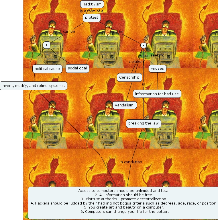 - create viruses, invent, modify, and refine systems. Access to computers should be unlimited and total. 2. All information should be free. 3. Mistrust authority - promote decentralization. 4. Hackers should be judged by their hacking not bogus criteria such as degrees, age, race, or position. 5. You create art and beauty on a computer. 6. Computers can change your life for the better. , + social goal, protest can be +, Hacktivism is a form of a protest, protest can be -, - violation Censorship, + political cause, breaking the law in conclution Access to computers should be unlimited and total. 2. All information should be free. 3. Mistrust authority - promote decentralization. 4. Hackers should be judged by their hacking not bogus criteria such as degrees, age, race, or position. 5. You create art and beauty on a computer. 6. Computers can change your life for the better. , + invent, modify, and refine systems., - seeking infrormation for bad use, - is breaking the law, - ???? Vandalism