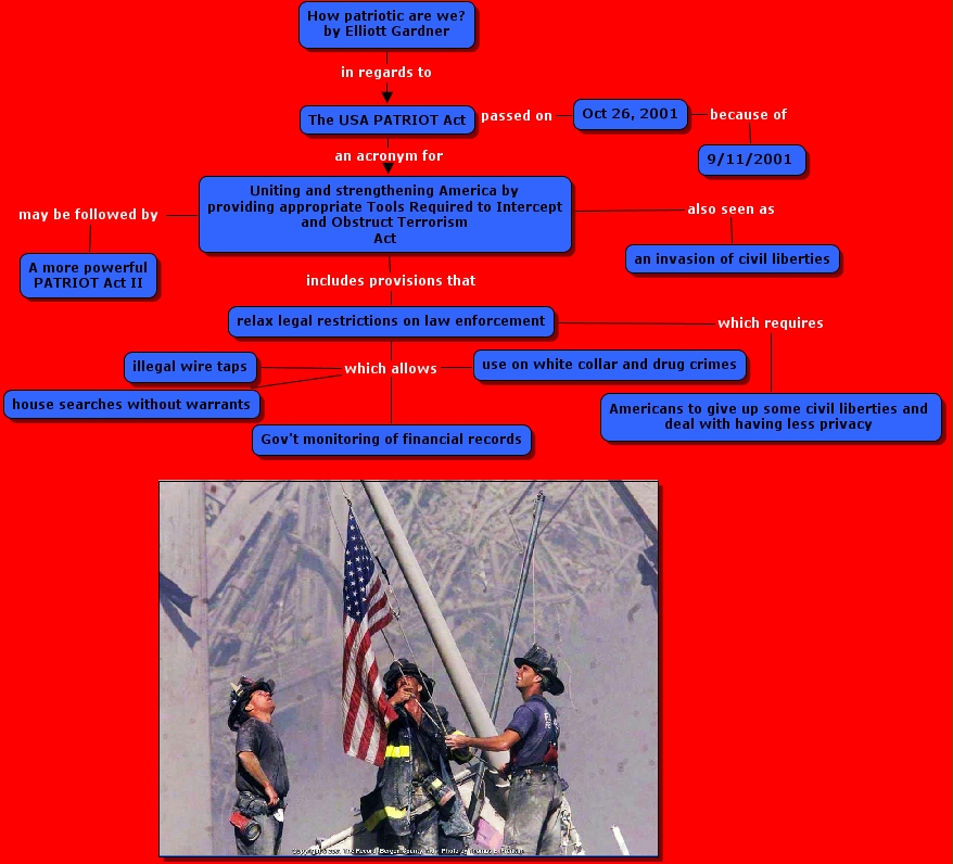 The USA PATRIOT Act passed on Oct 26, 2001, Uniting and strengthening America by providing appropriate Tools Required to Intercept and Obstruct Terrorism Act includes provisions that relax legal restrictions on law enforcement, How patriotic are we? by Elliott Gardner in regards to The USA PATRIOT Act, Uniting and strengthening America by providing appropriate Tools Required to Intercept and Obstruct Terrorism Act also seen as an invasion of civil liberties, Oct 26, 2001 because of 9/11/2001 , The USA PATRIOT Act an acronym for Uniting and strengthening America by providing appropriate Tools Required to Intercept and Obstruct Terrorism Act, Uniting and strengthening America by providing appropriate Tools Required to Intercept and Obstruct Terrorism Act may be followed by A more powerful PATRIOT Act II, relax legal restrictions on law enforcement which allows house searches without warrants, relax legal restrictions on law enforcement which allows illegal wire taps, relax legal restrictions on law enforcement which allows use on white collar and drug crimes, relax legal restrictions on law enforcement which allows Gov't monitoring of financial records, relax legal restrictions on law enforcement which requires Americans to give up some civil liberties and deal with having less privacy