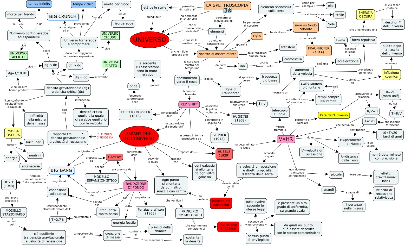 This Concept Map, created with IHMC CmapTools, has information related to: l'Universo modificato, aumento della velocià cioè una accelerazione, V=HR dove H=parametro di Hubble, RADIAZIONE DI FONDO dovuta alla espansione adiabatica, densità gravitazionale (dg) e densità critica (dc) il cui confronto risultadifficile a causa di difficoltà nella misura delle masse, telescopio Hubble mostrano un aumento della velocià, forza repulsiva che originerebbe una ENERGIA OSCURA, telescopio Hubble permette di avere informazioni su tempi sempre più remoti, R/V=H che deriva da V=HR, la velocità di recessione è dirett. prop. alla distanza dalla Terra visualizzabile con il modello del palloncino, dg = dc si avrebbe UNIVERSO PIATTO, UNIVERSO le cui stelle emettono uno spettro di assorbimento, gas che si trovano nella cromosfera, ESPANSIONE DELL'UNIVERSO proposta da HUBBLE (1929), MASSA OSCURA forse buchi neri, elementi sconosciuti sulla terra che si trovano su Sole, forza repulsiva secondo la legge F=ma, ESPANSIONE DELL'UNIVERSO confermata dalla RADIAZIONE DI FONDO, R/V=H che insieme forniscono T=1/H, H=parametro di Hubble il cui valore non è determinato con precisione, creazione di massa per mantenere costante la densità