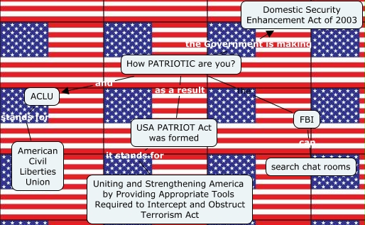 此概念图以 IHMC CmapTools 创建, 内含信息有关于: LaTasha Taylor, ACLU stands for American Civil Liberties Union, How PATRIOTIC are you? and ACLU, How PATRIOTIC are you? the Government is making Domestic Security Enhancement Act of 2003, FBI can search chat rooms, How PATRIOTIC are you? the FBI, USA PATRIOT Act was formed it stands for Uniting and Strengthening America by Providing Appropriate Tools Required to Intercept and Obstruct Terrorism Act, How PATRIOTIC are you? as a result USA PATRIOT Act was formed