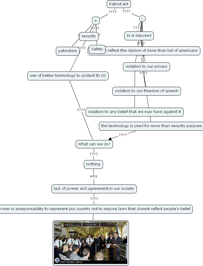 the technology is used for more than security purpoes ???? What can we do?, - ???? violation to our freedom of speech, Patriot Act ???? -, + ???? Safety, + ???? use of better technology to protect th US, - ???? violation to any belief that we may have against it, - ???? violation to our privacy, Patriot Act ???? +, use of better technology to protect th US ???? What can we do?, nothing why lack of power and agreement in our society, + ???? patriotism, - ???? Is is imposed, Power is aresponsability to represent pur country not to impose laws that doesnt reflect people's belief ???? ????, lack of power and agreement in our society ???? Power is aresponsability to represent pur country not to impose laws that doesnt reflect people's belief, - ???? it doesnt reflect the oipnion of more than hal of americans, What can we do? ???? nothing, - ???? the technology is used for more than security purpoes, + ???? security