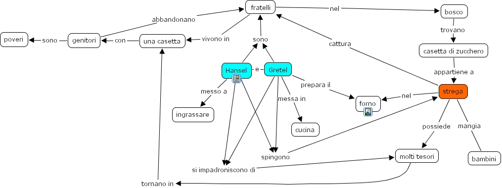 bosco trovano casetta di zucchero, Gretel messa in cucina, strega nel forno, casetta di zucchero appartiene a strega, Hansel sono fratelli, fratelli nel bosco, genitori sono poveri, strega cattura fratelli, genitori abbandonano fratelli, Hansel si impadroniscono di molti tesori, strega possiede molti tesori, una casetta con genitori, fratelli vivono in una casetta, Hansel messo a ingrassare, strega mangia bambini, Gretel sono fratelli, molti tesori tornano in una casetta, Hansel e Gretel, Gretel prepara il forno, Gretel si impadroniscono di molti tesori, Hansel spingono strega, Gretel spingono strega